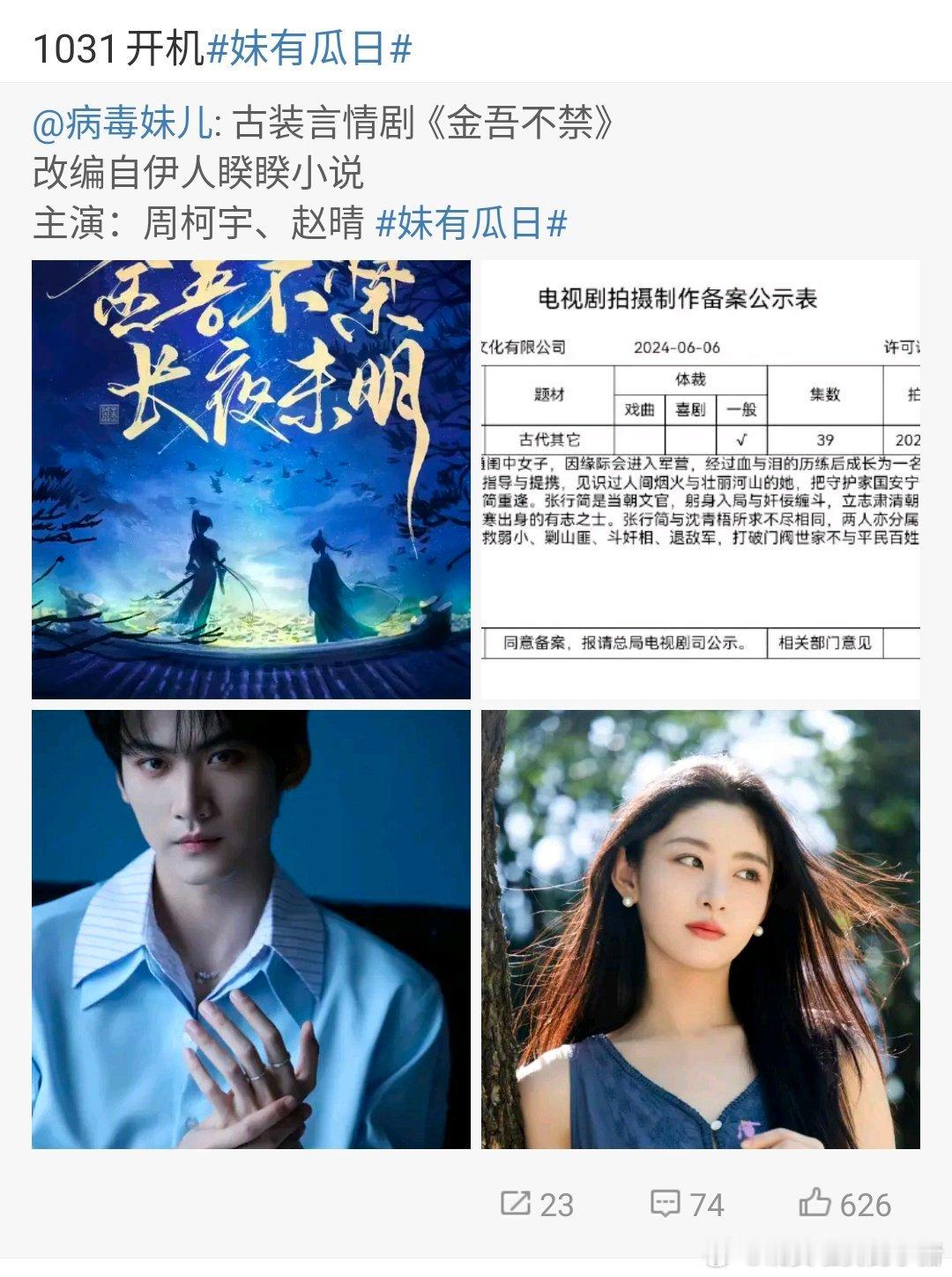 周柯宇、赵晴、夏之光金吾不禁月底开机[黄鸡大笑][黄鸡大笑]