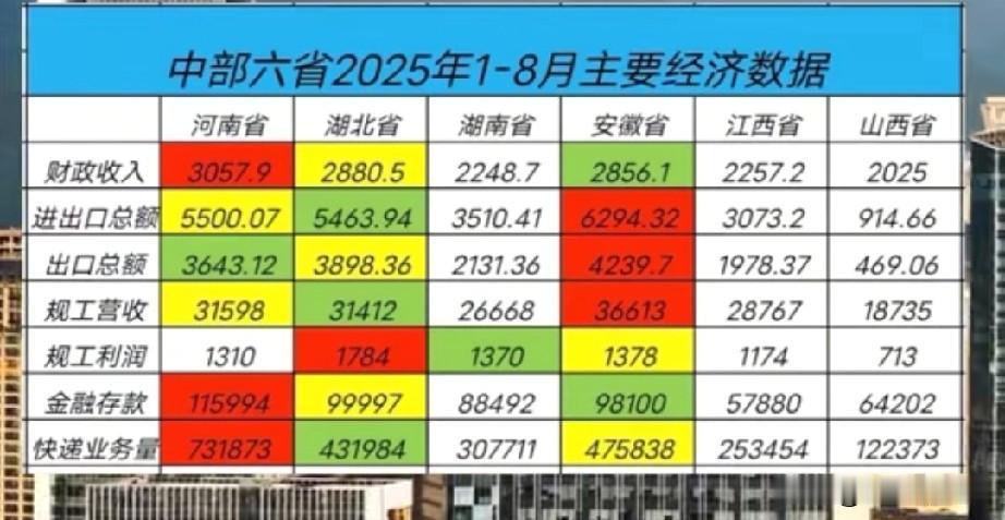 安徽经济数据前8个月都很亮眼,不知道gdp会不会有惊喜? 2025年前三季度各省市gdp将于10月20号开始,陆续公布,前三季度gdp数据怎么样?对于全年省份名次排定,也是有重大影响。 涉及安徽部分,今年1-8月,各项经济数据都很亮眼,在中部六省里,安徽的财政收入排名第三,进出口总额排名第一,出口总额排名第一,规工营收排名第一,规工利润排名第二,金融机构存款排名第三,快递业务量排名第二。 7大经济数据,中部六省里,安徽3个第一,2个第二,2个第三。 前三季度,安徽省gdp会不会有惊喜,拭目以待吧。安徽经济排名 安徽经济实力 安徽县域gdp 安徽发展现状 安徽城市竞争力