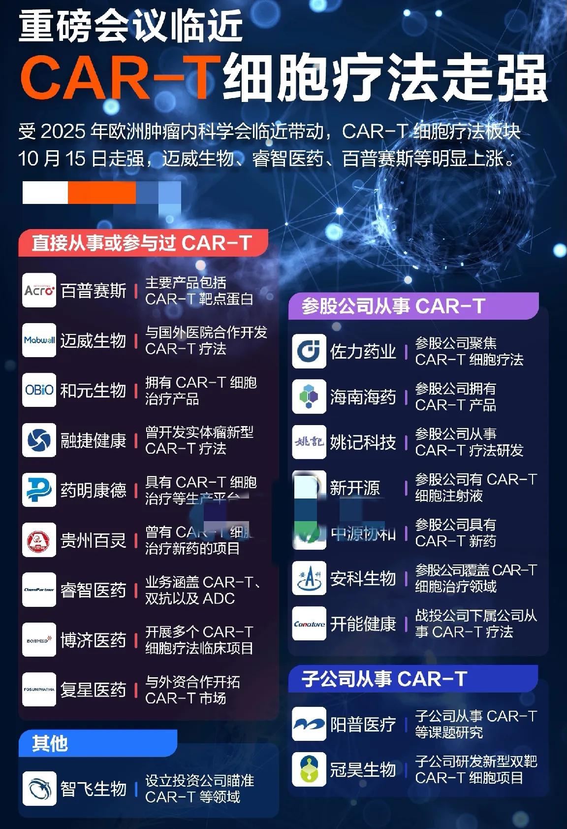 不同投资主题下的热点板块及代表企业: 1. 避险+高股息资产:在市场震荡背景下,燃气、煤炭、银行等高股息资产表现突出,图中列出了银行保险、有色、煤炭、航运港口、大消费、燃气、钢铁七大行业的相关代表公司,强调其稳定收益与防御属性。 2. 充电装置板块:受电动汽车充电设施“三年倍增”政策刺激,板块走强,涉及直接参与建设运营、子公司涉足以及相关配套技术(如无线充电、充电模块)的企业,如奥特迅、众业达、金冠股份等。 3. CAR-T细胞疗法:因2025年欧洲肿瘤学会议临近,相关概念10月15日走强,包括直接从事、参股、子公司布局及战略投资CAR-T疗法的公司,如迈威生物、佐力药业、智飞生物等。 4. 国产软件:受美国可能限制关键软件出口影响,国产软件板块爆发,涵盖信创(操作系统、数据库、办公软件等)和工业软件(BIM、EDA、CAD等)两大类,如中国软件、金山办公、中望软件等。 5. 储能板块:受益于风光发电发展及海外需求,板块持续走强,涉及PCS及大储集成、电池、算力电力协同、储能EPC、就近消纳等细分领域企业,如阳光电源、宁德时代、派能科技等。 6. 风电概念股:按产业链梳理,包括上游零部件(叶片、齿轮箱、塔筒等)、中游整机制造(金风科技、明阳智能等)、下游风电运营(龙源电力、三峡能源等)相关公司。 7. 国产替代半导体核心龙头:列出在芯片制造、设备、材料、封测等细分领域领先的国内企业,如中芯国际(晶圆代工)、北方华创(设备)、韦尔股份(CIS芯片)、长电科技(封测)等。 8. 未来IPO科技概念股:汇总可能IPO的科技领域相关概念股,包括上海微电子、宇树机器人、摩尔概念、长江/长鑫存储、紫光展锐、燧原、壁仞等,涉及张江高科、中芯国际、兆易创新等多只股票。 整体围绕当前市场热点,涵盖高股息避险资产、新能源(充电/储能/风电)、科技成长(半导体/软件/CAR-T/IPO概念)等方向,为投资者提供细分板块及重点企业参考。