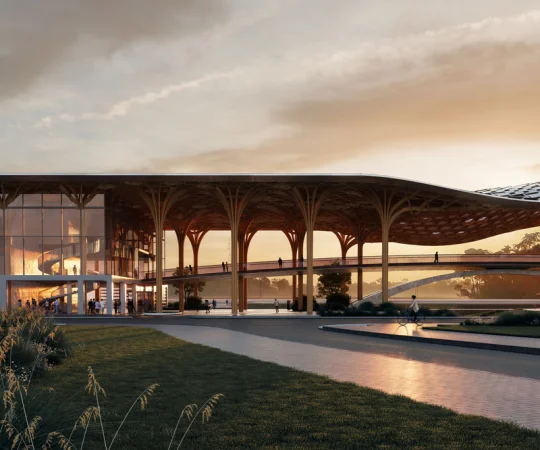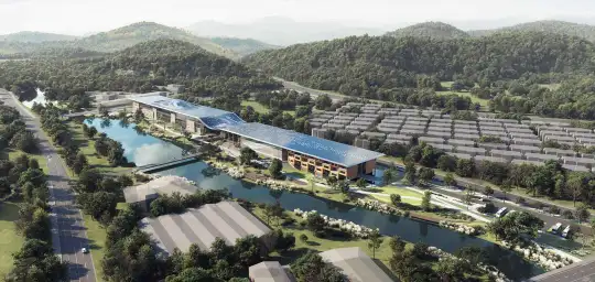 //古城"小舟"意象:建筑呈长条形,静卧于良渚港畔。从空中俯瞰,恰似一叶穿梭于历史水道上的"小舟"或"竹筏",致敬了5000年前良渚古城作为水城的历史