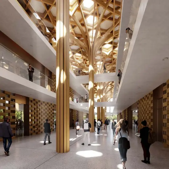 //巨型"稻谷"意象:设计师从良渚稻作文明中汲取灵感,提取稻穗形态,结合本地材料竹材,构建了建筑的主要构件——挺拔的"树形柱"。这一设计呼应了良渚发达的稻作农业,也让人联想起"收获的稻田"的丰收景象。