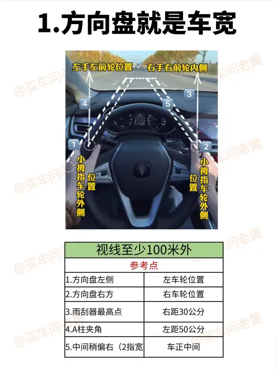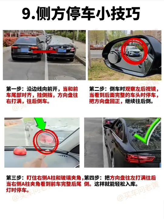 新司机上路看这篇就够了~ ✅图2 "1.方向盘就是车宽" ✅图3 "2.后视镜怎么调节" ✅图4 "3.靠边停车技巧" ✅图5 "4.判断前后左右车距" ✅图6 "5.转弯出库小技巧" ✅图7 "6.过窄路小技巧" ✅图8 "7.3步倒车入库小技巧" ✅图9 "8.判断与障碍物距离" ✅图10 "9.侧方停车小技巧" 如里您觉得有用,请👍➕🌟, 买车一定用的上! ✔️✔️✔️✔️✔️✔️✔️✔️✔️✔️ 老黄从事汽车行业10多年 买车用车关🐷老黄: 买车避坑 可全国邦提车 给底价 用车技巧