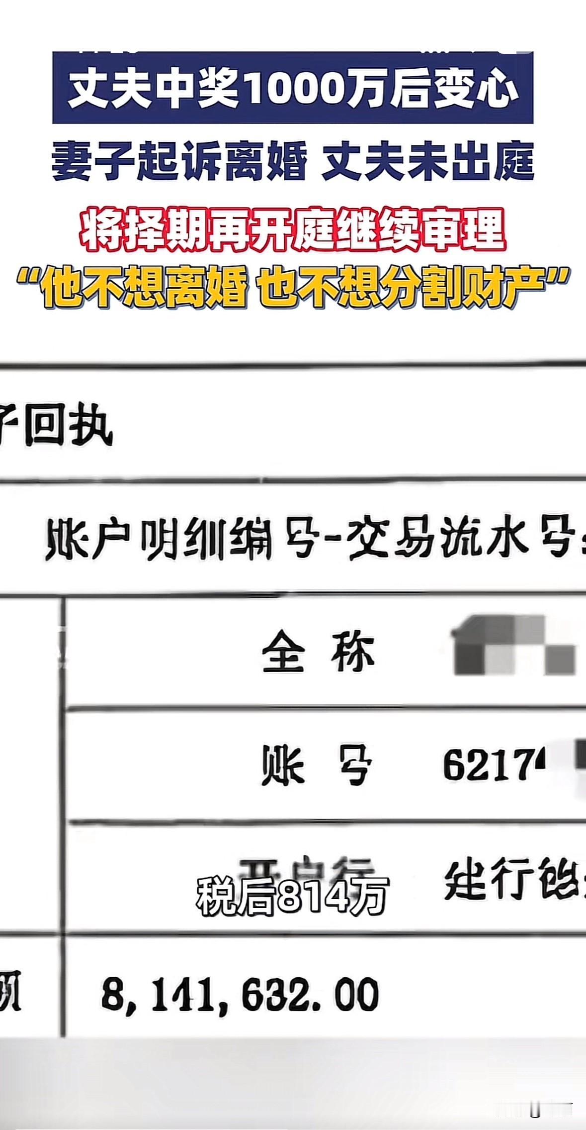 山东德州苑女士的丈夫花42元买彩票,中了1017万,税后814万。中奖后丈夫彻底变了,偷偷转走710万,还拿空卡骗她说存了300万养老。 他天天刷主播视频,累计打赏120万,谎称有事带主播旅游4天,回来时被苑女士在车站撞见。苑女士起诉离婚,开庭时丈夫没出庭,案子得择期再审,他不想离婚也不想分财产。 律师说婚内彩票奖金是共同财产,丈夫转移财产能让他少分。 这哪是有钱变坏,是本性暴露。十年感情抵不过意外横财,钱成了照妖镜,照出最不堪的算计。婚姻里的信任和担当,比千万奖金金贵多了。