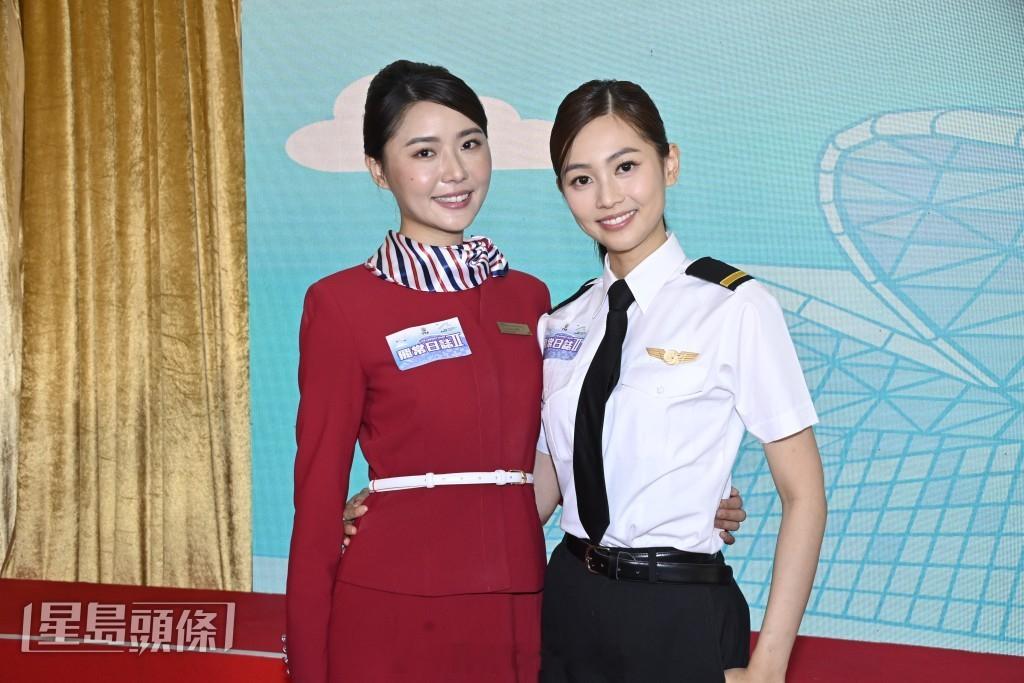 郭柏妍和戴祖仪今日(17日)现身机场出席《飞常日志II》开镜仪式,戴祖仪在台上笑言新一辑的她已升职,就连头上发髻也变得扎得高,但今次自己亦刻意减去4公斤演出。她说:“上一辑好多人话我霸住屏幕位置,所以我要减肥戒食薯片,食东西两、三口就饱啦!”她又爆扮演见习机师的郭柏妍有一副专属黑超,对方面细细,但戴上巨型黑超好搞笑。
