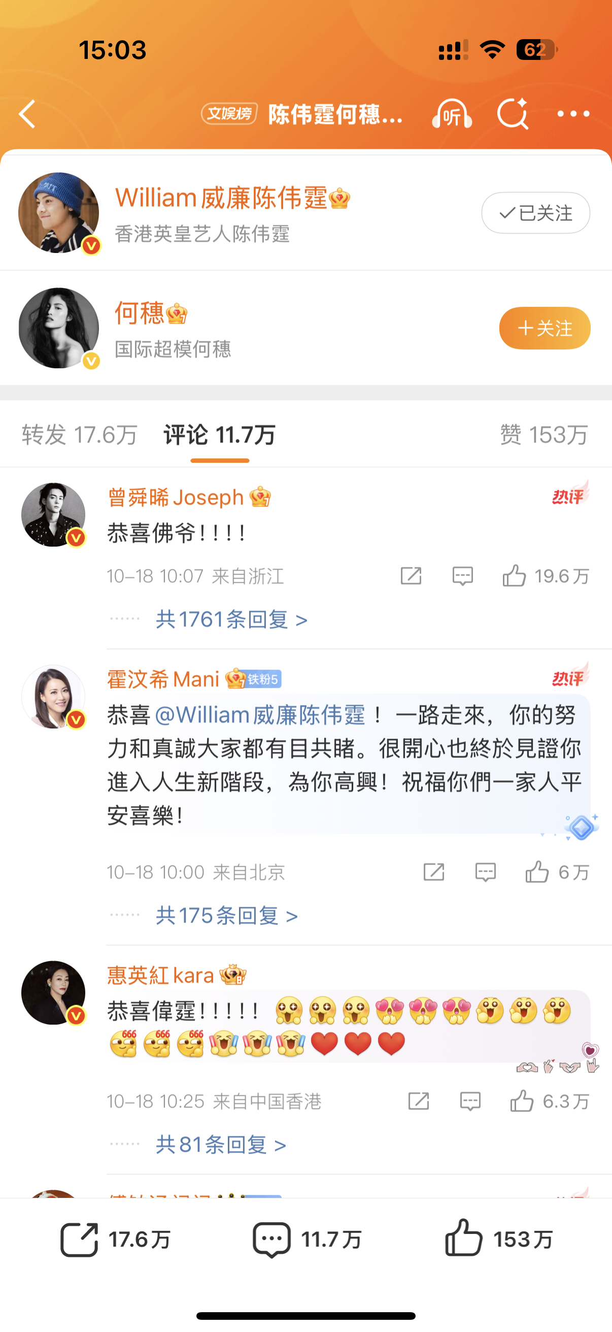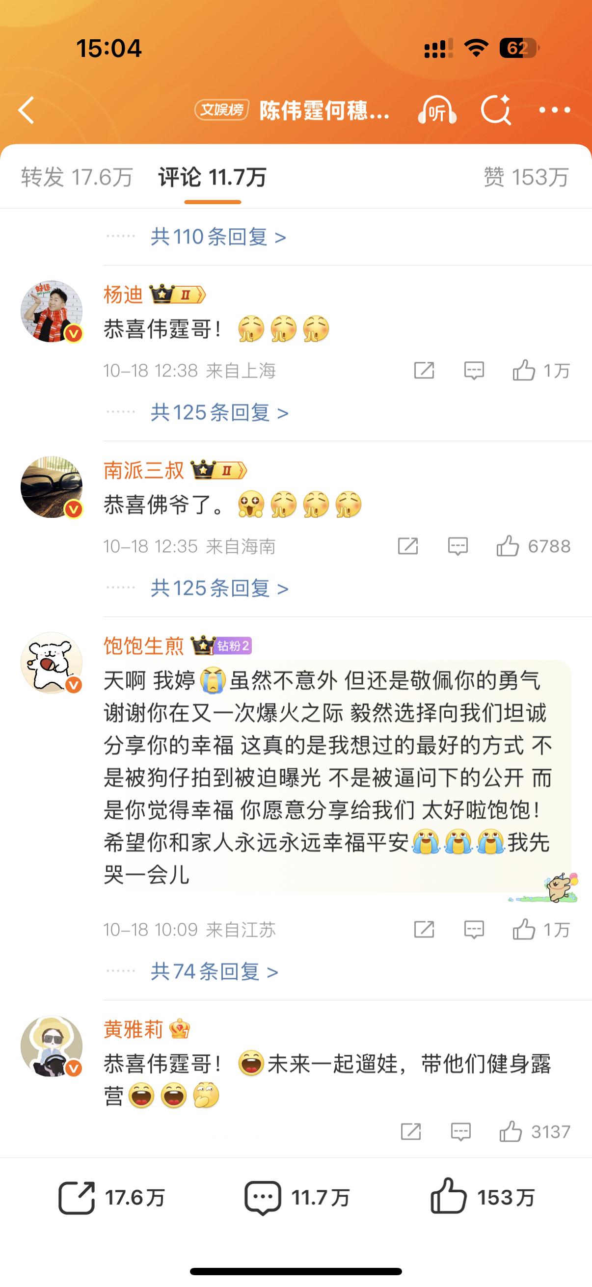 众星恭喜陈伟霆何穗生子好家伙,你们俩人唔得真严啊,闷声干大事!曾舜曦、惠英红、霍汶希等好友都来恭喜佛爷了[送花花]