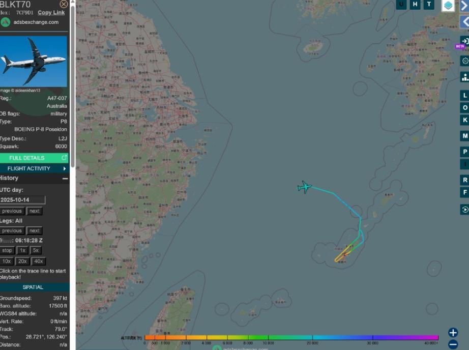 10月14号,不顾中方强大阵容,澳大利亚P-8A坚持进入东海!