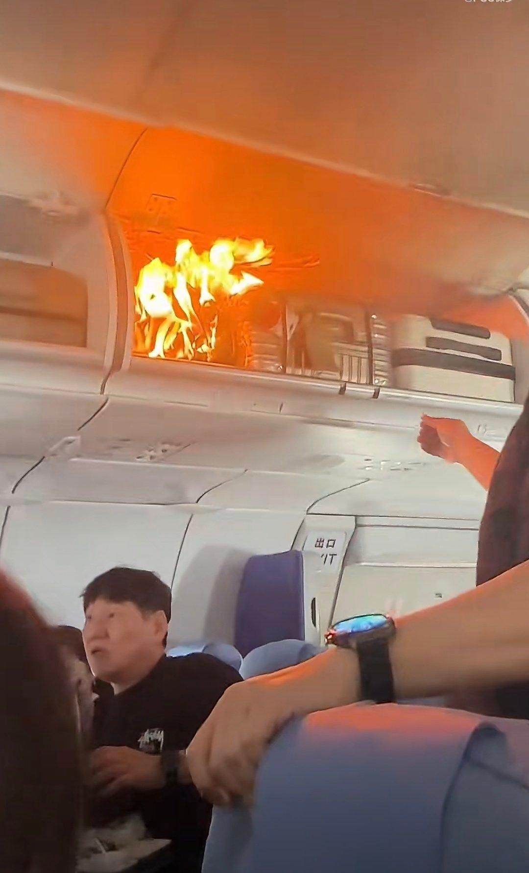 飞韩国的航班行李架起火 我天!坐下面的人还不赶紧跑开[晕]不知道是什么东西燃了?