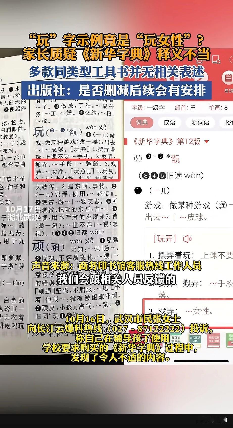 武汉张女士辅导一年级孩子时,发现第12版《新华字典》“玩”字释义下有“戏弄:玩女