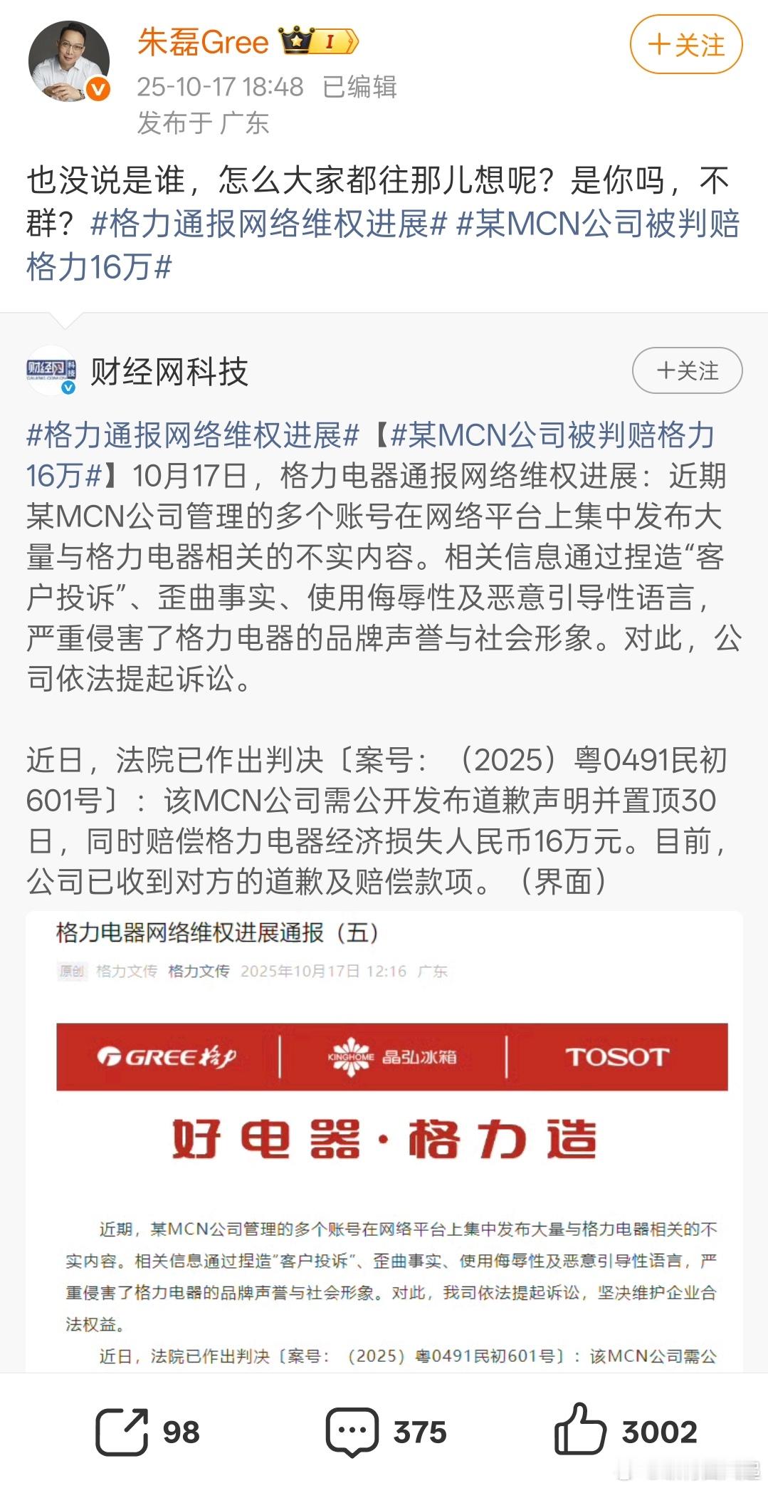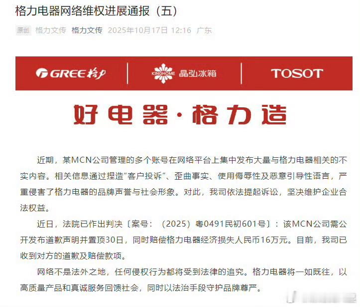 某MCN公司被判赔格力16万 ​​​