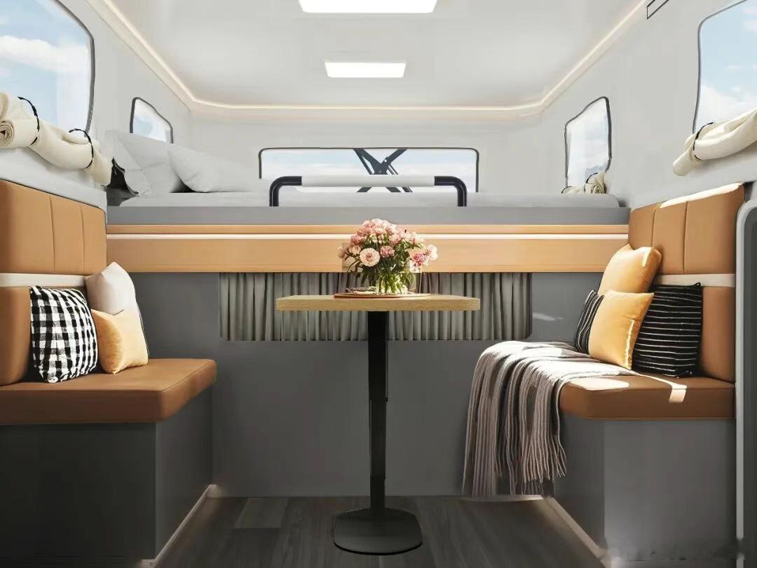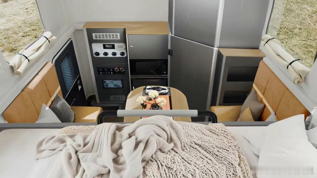 车内一共两张床,其中额头床宽1.8m,内高0.9m,支持1.8-2.055m长度拓展;卡座变床后,尺寸为0.76x2m;此外还带有0.85㎡卫浴空间、全电厨房(电磁炉/微波炉/冰箱)、1.1kW暖风机、12.3英寸双联屏、手动驻车支腿、车尾外置储物仓