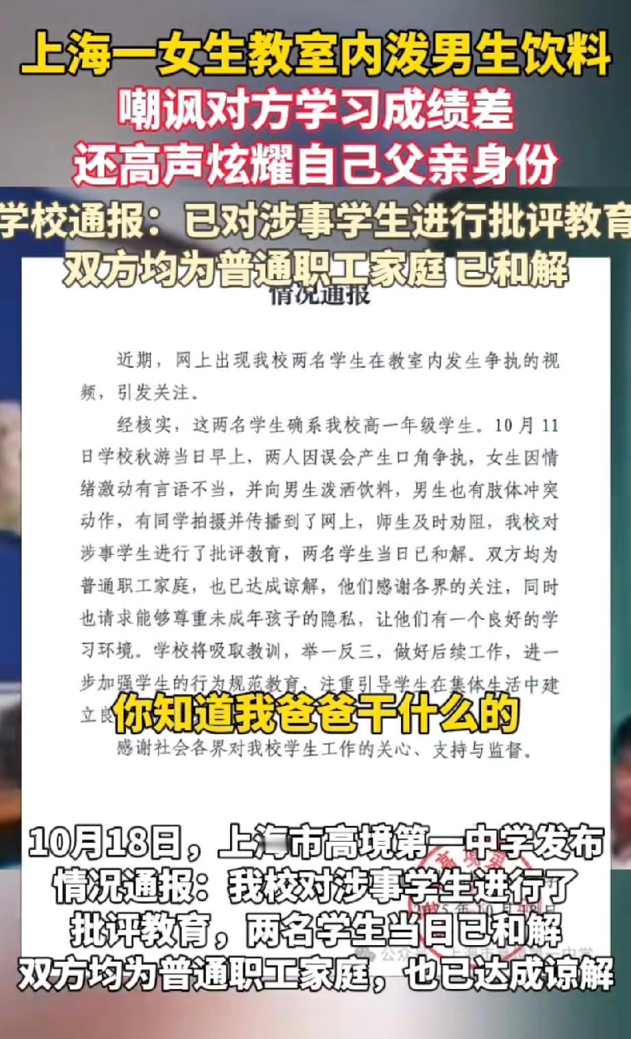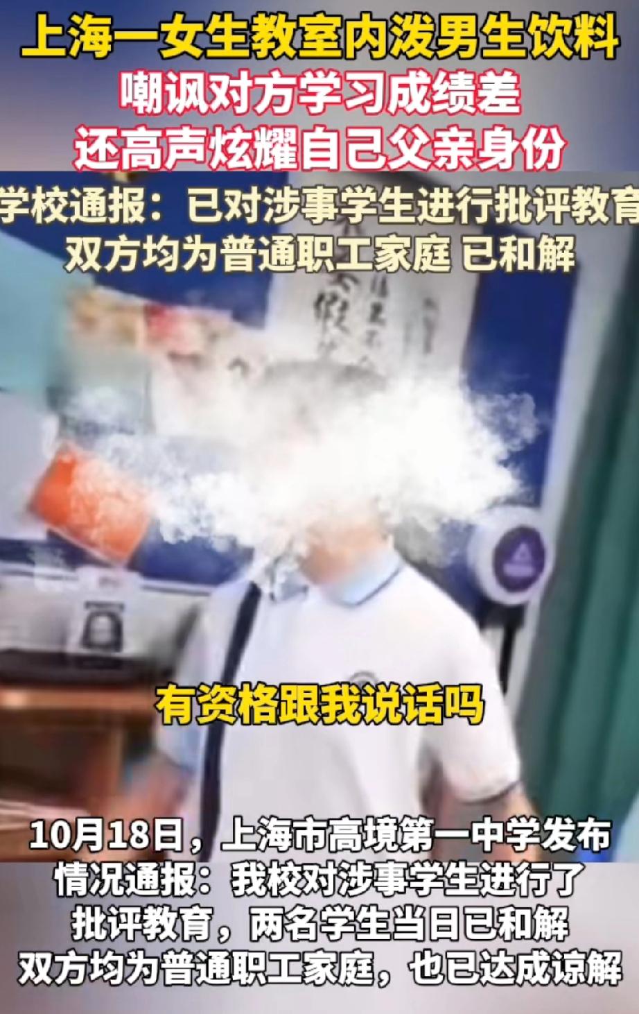 高一女生用饮料泼洒男同学,又出言讽刺道:“中考成绩那么差,没资格跟我说话,你知道