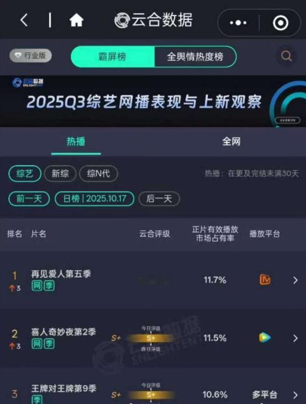 再见爱人第五季 11.7% 的成绩,体现观众对真实情感表达的青睐,没有被娱乐化内容冲淡,再见爱人云合登顶,让婚姻话题获得更广泛关注。再见爱人云合登顶再见爱人第五季11.7%