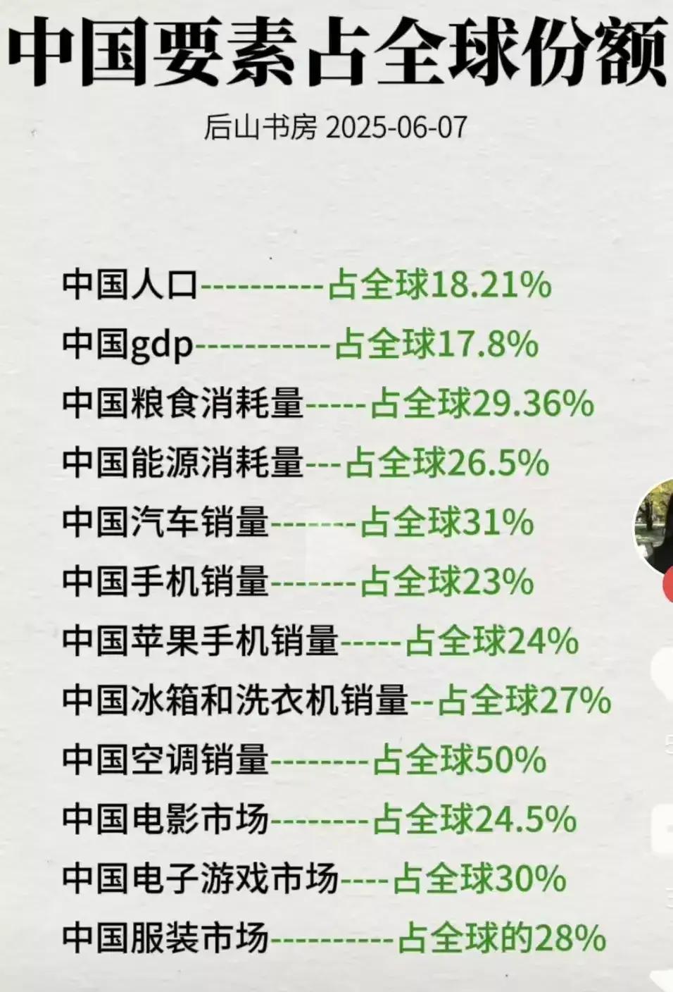 为什么中国人在生活水平上有较大的幸福感呢? 我们一直强调幸福感与生活感,甚至是幸福指数这一类的虚的指标,是因为有一些实际指标与外国可比性不是很大。 在占全球比例上,中国的人口18.21%,中国的GDP17.8%。这表明从GDP人均水平上看,中国略低于是平均水平。2024年,中国的人均GDP为1.35万美元,预计2025年将增长至1.5万美元,预计到2025年全球人均GDP预计将超过19244美元,中国的人均GDP与全球平均水平仍存在一定差距。 中国与俄罗斯、阿根廷、保加利亚这些国家人均GDP差不许多,但你能感觉出中国的日常支出,获得感和生活水平呢,确实是比他们要好一些。 这张图的另外的一些指标也说明中国所占有的其他消费,或者是人均数量是高于全球水平。占全球总数比例,中国消耗粮食29.36%,中国消耗能源26.5%,这两项都大大的高于人口占比10个百分点和8个百分点。这也表明了我们国家努力解决了温饱问题,吃饭还要吃饱吃好和粮食消耗已经大大的高于世界平均水平了,其中除于除了自己保证了80%的粮食还在外面进口了许多。今天看到一个博主说吃大米饭就是为了吸收油腻,俺家吃饱饭才几天呐,就这样糟蹋粮食吗?我也是很气愤。浪费粮食,这种人,这种歪风邪气,必须打压一下。 能源是国家的工业食粮啊。他这里就是指石油天然气和煤。前些年我们为了能源充足,只要是出访就得联系能源大国,为国家开辟了从亚洲到非洲再到南北美洲的能源采购大单,保证了中国能源的充足。中国是能源消耗大国,在。新能源汽车和清洁能源方面,中国付出了很大努力,就是要减少这种油气能源石化能源的消耗。 其他这些指标用于大量的产品是中国生产的。你自己想。价格上或者是材料上,成本上都比较低,所以我们自己享受了很多。 最重要的就像汽车。我们使用了占有了全球近1/3的汽车,表明我们汽车的原价和使用汽车的成本都是很低的,也说明我们的生活水平大幅度提高。 手机是我们生活当中的必备、必配的生活物质,不可缺少,就像我们的手和大脑自然延伸一样。当然了,中国人民对苹果手机还是有一种你从眼神里的喜欢用的比例多一些,也是可以理解。 空调、洗衣机有服装这样的东西,中国占比比较大,这说明我们的生活水平和生活习惯大大高于全球的平均水平。在不发达国家看都看不到的东西,在我们这里就是家庭中的必备的生活设施。甚至在发达国家都不常用的东西,据说法国就没有多少空调,在中国不能说是家庭必备,也差不许多。而服装,据说中国的二手服装已经到巴黎服装市场变成了时尚了。 不仅是在物质消耗领域我们领先,我们在精神在文化消耗领域也已经走在世界的最前列。像电影,我们动辄出大片就领先了全世界,像电子游戏消费市场,我们也有大量的年轻人愿意熬夜玩一玩。 从纯指标上看,我们也确实能感觉我们的幸福感、获得感是确实有的,因为我们的大多数指标都是超过了人口占比,增加从个位数几个百分比到10个、30百分比都有。当然了,我们不会停止,还要继续提高扩大我们的能力和水平,过好我们的日子。 未来我们在自己消费的同时,也要带动全世界消费,尤其是我们的一些产品商品,无论是硬件的软件的,未来还是应该大有市场潜力的。甚至我们的有一些生活习惯也可以给全世界带动一下拉动一下。