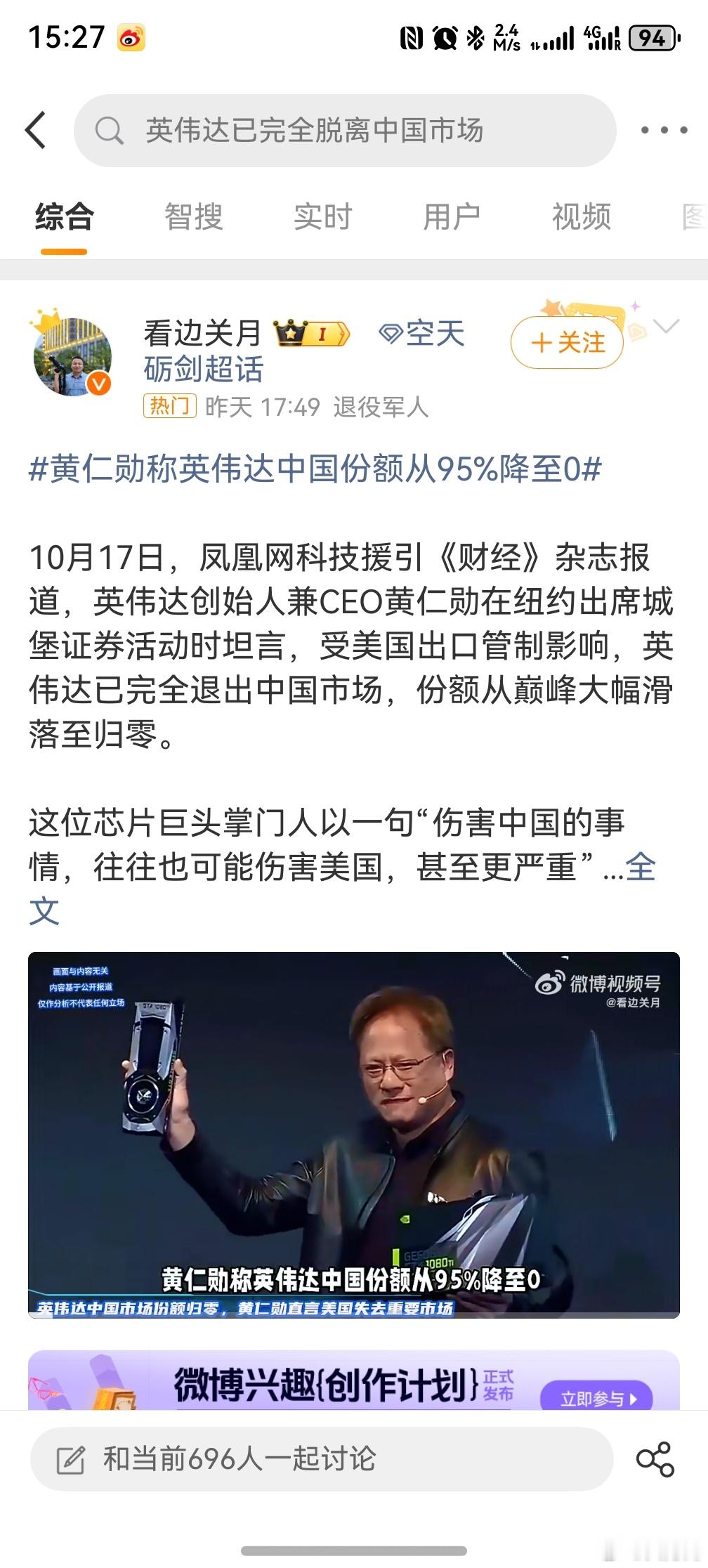 老美开心了,终于让英伟达倒闭了!刚刚英伟达总裁黄仁勋对外宣布:中方市场份额降