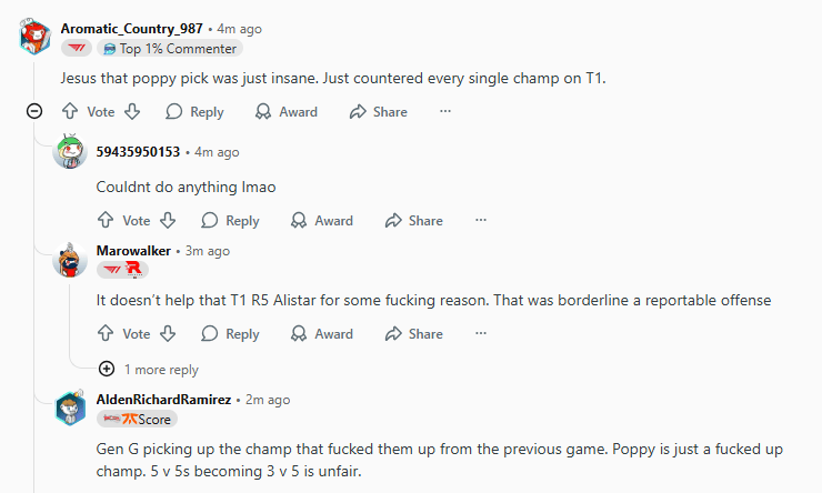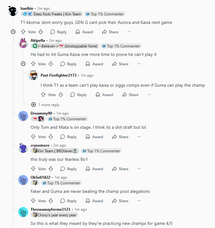 虎扑10月18日讯GEN击败T1引发了Reddit网友热议,部分内容如下: