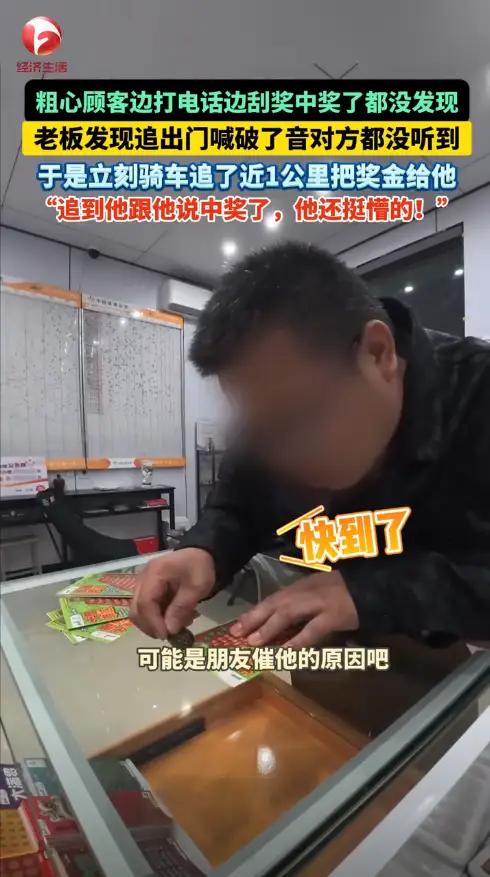 山西临汾,一男子到彩票店刮彩票,刮到一半时突然接到朋友打来的电话,男子一看也没有大奖,直接就转身离开,随后老板发现中了20块,明知道对方回不来了,男子却还是追了男子一公里,那钱兑给了他。 彩票店正常营业时,一位男顾客推门而入,选了张刮刮乐后便站在柜台前刮起来,闲聊间老板得知,对方正在等朋友一起吃饭。 刮到一半,顾客的手机突然响起,电话那头的朋友频频催促。他匆匆应下“给我点一碗羊杂汤,马上到”,挂断电话后加,便随手将彩票放在桌上,转身匆匆离去。 彩票店老板收拾柜台时,顺手拿起了这张遗弃的彩票。出于习惯,他用机器扫了一下,屏幕上显示着20元的中奖金额。虽然金额不大,且顾客早已走远,想起了对方提到的羊汤店地址,当即从抽屉里取出20元现金,锁好店门就骑上电动车追了出去。 一公里的路程不算近,等彩票店老板推开羊汤店的门时,正在等餐的顾客见到他很是诧异,还以为老板也是来吃饭的。直到递过彩票和现金,说着“你刚才中的奖,忘了拿”,他才反应过来。顾客又惊又感动,连连道谢。 小生意见大格局,小人物有大情怀。彩票店老板这一公里的追赶,追上的是顾客的信任,赢回的是长久的口碑。这份藏在烟火气里的真诚,恰恰是最动人的温暖。为这样的诚信老板点个赞!