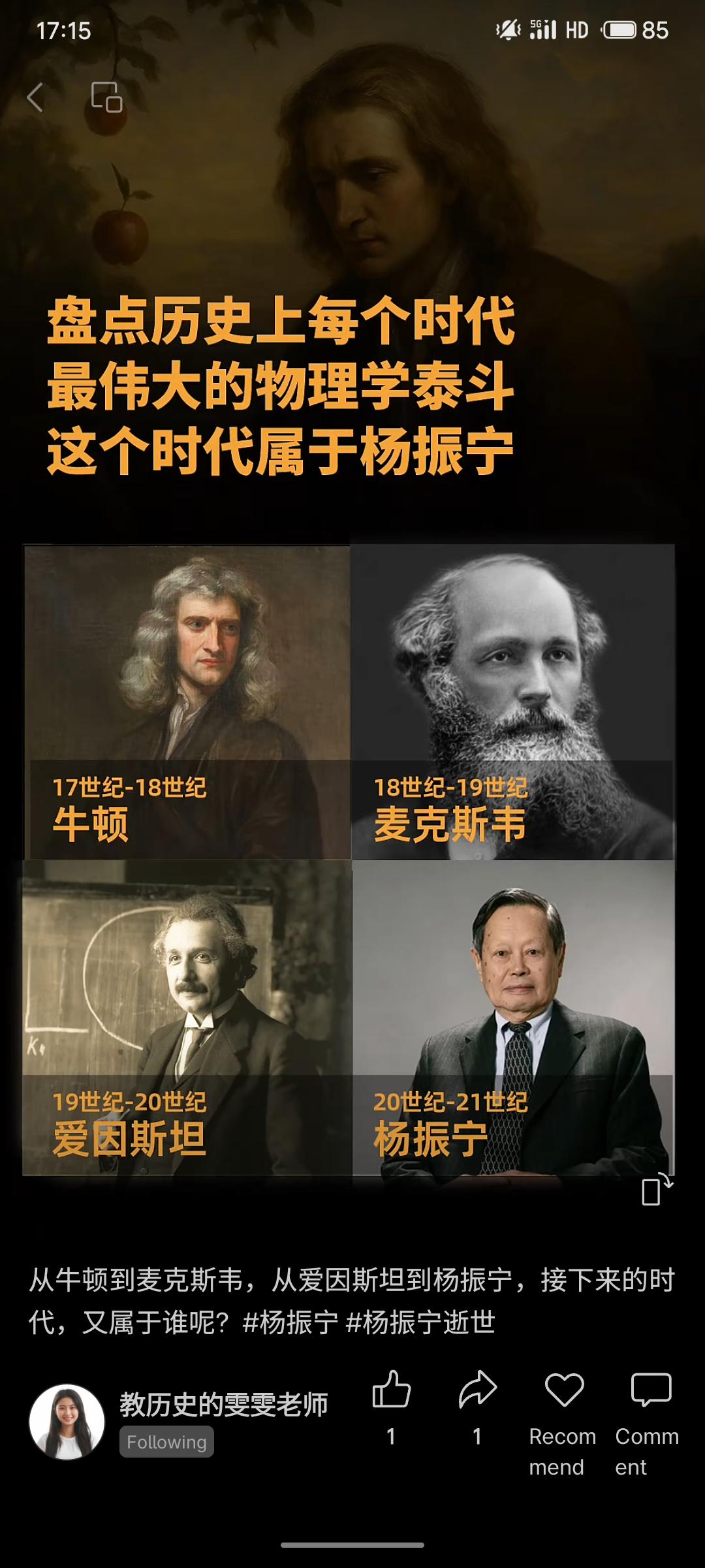 物理学发展的四个时代,代表人物分别牛顿、麦克斯韦、爱因斯坦和杨振宁,斯人已去,“下一个时代属于谁”,让我们以此致敬先贤。 杨振宁在物理学史上的卓越贡献,足以与牛顿、爱因斯坦并列,其开创性成果对现代物理产生深远影响,但亦引发了我们对本土科学传承的思考。
