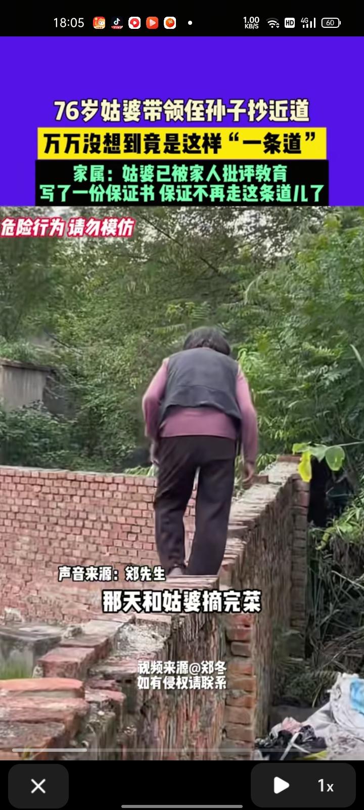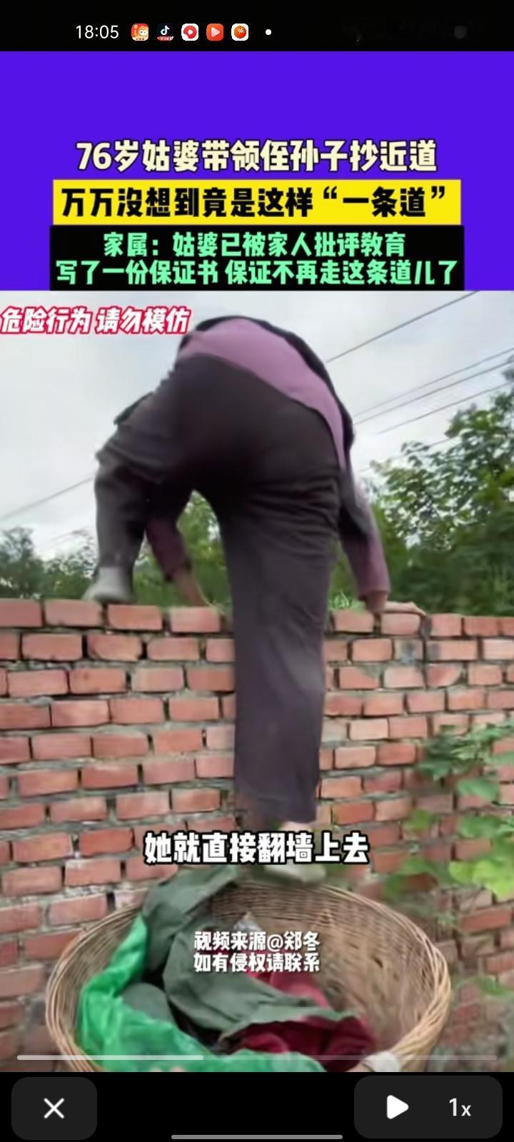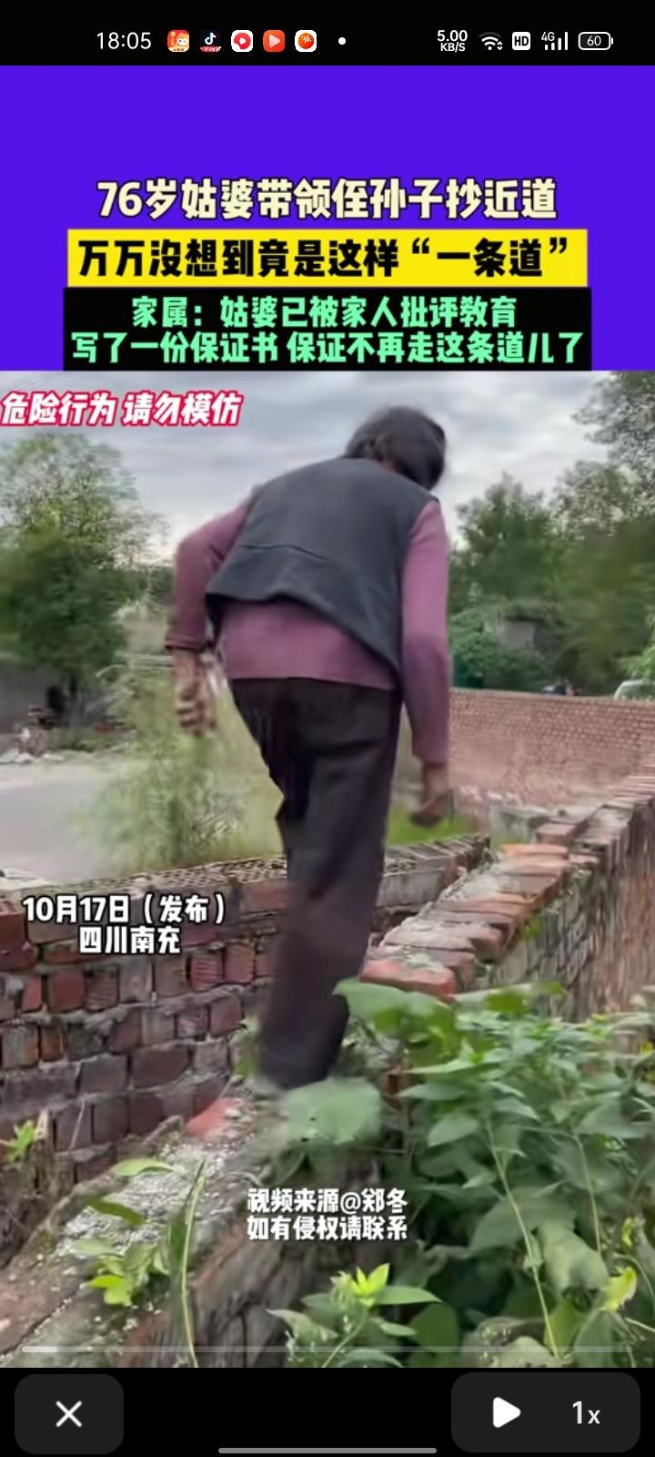 10月17日,南充市营山县,网友发视频称,去菜地的路被封了,76岁姑婆摘完菜后就抄近道,没想到她直接翻墙上去,无奈之下自己硬着头皮走上去了。视频被家人看到后,姑婆被家人批评教育,保证再也不走这条近道了。