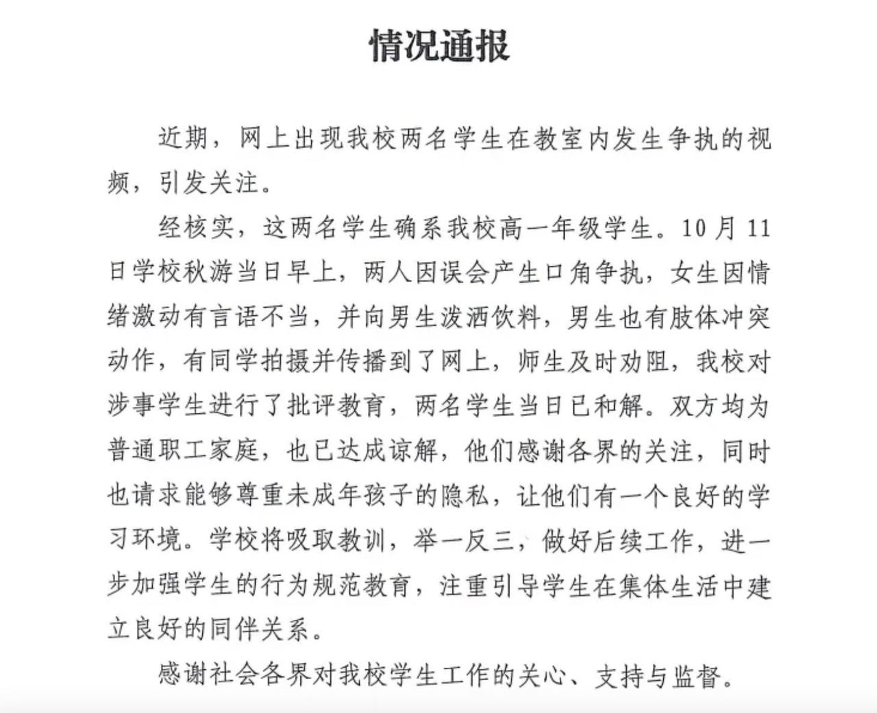 上海一中学女生向男同学泼2瓶饮料,并且还当众叫嚣着,你知道我爸是干什么的事件,迎来了大结局。 就在10月18日,涉事学校发出了通报,称这起事件就是一场误会,当时女生情绪有点激动,说出了不当的言论,还向男生泼了饮料,而男生也有肢体冲突动作,而事发时师生就进行了及时劝阻,当时二人就已经和解了,事后他们也都被学校批评教育了,并且双方都是普通职工家庭。这起事件看似到了这,应该画上一个句号了,可仍旧有2个问题引发了大家的质疑。 第一个问题,学校处理是否公平的问题?从学校的通报来看,涉事2名学生都存在问题,所以都是被批评教育,这就是典型的各打五十大板。可事实上呢?男生所谓的反击,是在被对方挑衅与侮辱后做出的,应该是情有可原的,并且也是可以从轻发落的,可学校却是一视同仁处理,看似是在公平处事,实则是对男生的重罚,对女生的轻判。 第二个问题,女生的爸爸到底是谁?在网上所曝出的视频来看,女生一直是满满的优越感,尤其是在提到自己爸爸的时候。可通报中却只是写着情绪激动所以言语不当,这个解释是有点牵强的。人在情绪激动的时候,大脑是被感性所控制,此时所说的话是不经过大脑思考的,言外之意就是生气时大部分的话,其实都是真心话。 所以如果女生的爸爸只是一位普通的职工,她又怎么会特意向对方强调这一点呢?而且大家再注意一个细节,女生向男生泼饮料的时候,却没有一个人前来制止,大家都是在冷眼旁观。反而是男生还手的时候,一群旁观者却及时出手制止了,所以最后学校所发的通报结果,多少是让人很难信服的。 再者,学校是教书育人的地方,老师也应该教过学生平等待人,可这位女生却以分待人,以职业待人,似乎在她的眼中成绩差就要低人一等,父母职业不光鲜孩子就要抬不起头,这样的唯分数论,唯职业论,与素质教育的本质相去甚远,所以学校这方面的教育还是任重而道远!