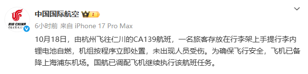 【#杭州飞韩国一航班发生锂电池自燃# 】#飞韩国的航班行李架起火# 10月18日,由杭州飞往韩国首尔的国航CA139航班发生锂电池自燃,机组按程序立即处置,未出现人员受伤。