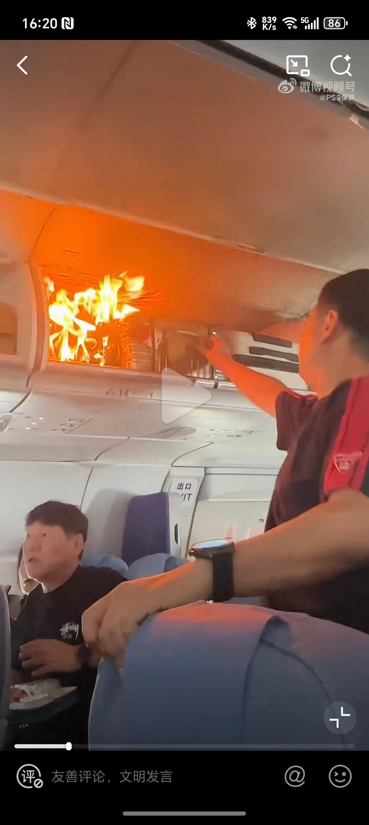 飞韩国的航班行李架起火看到这条视频,我在想,行李架下方的这个乘客为啥还在座位上,先到别的地方躲一躲不更安全吗[震惊]