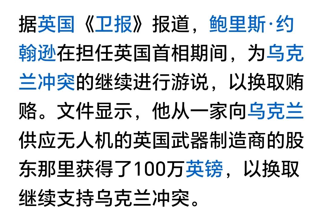 英国前首相大金毛约翰逊问了一个问题,英国商人的100万英镑和乌克兰商人的100万英镑谁更卑鄙谁更高尚? 是不是没有办法回答这个问题。 英国《卫报》给出了答案。 为什么有段时间约翰逊在援助乌克兰打仗这件事情上窜下跳,因为他拿了英国军火商的钱,他拿了钱! 没有正义,没有主义,只有生意。 拿钱办事,果然这很老牌资本主义。 点右上角关注我,我们一起去看这个魔幻的世界
