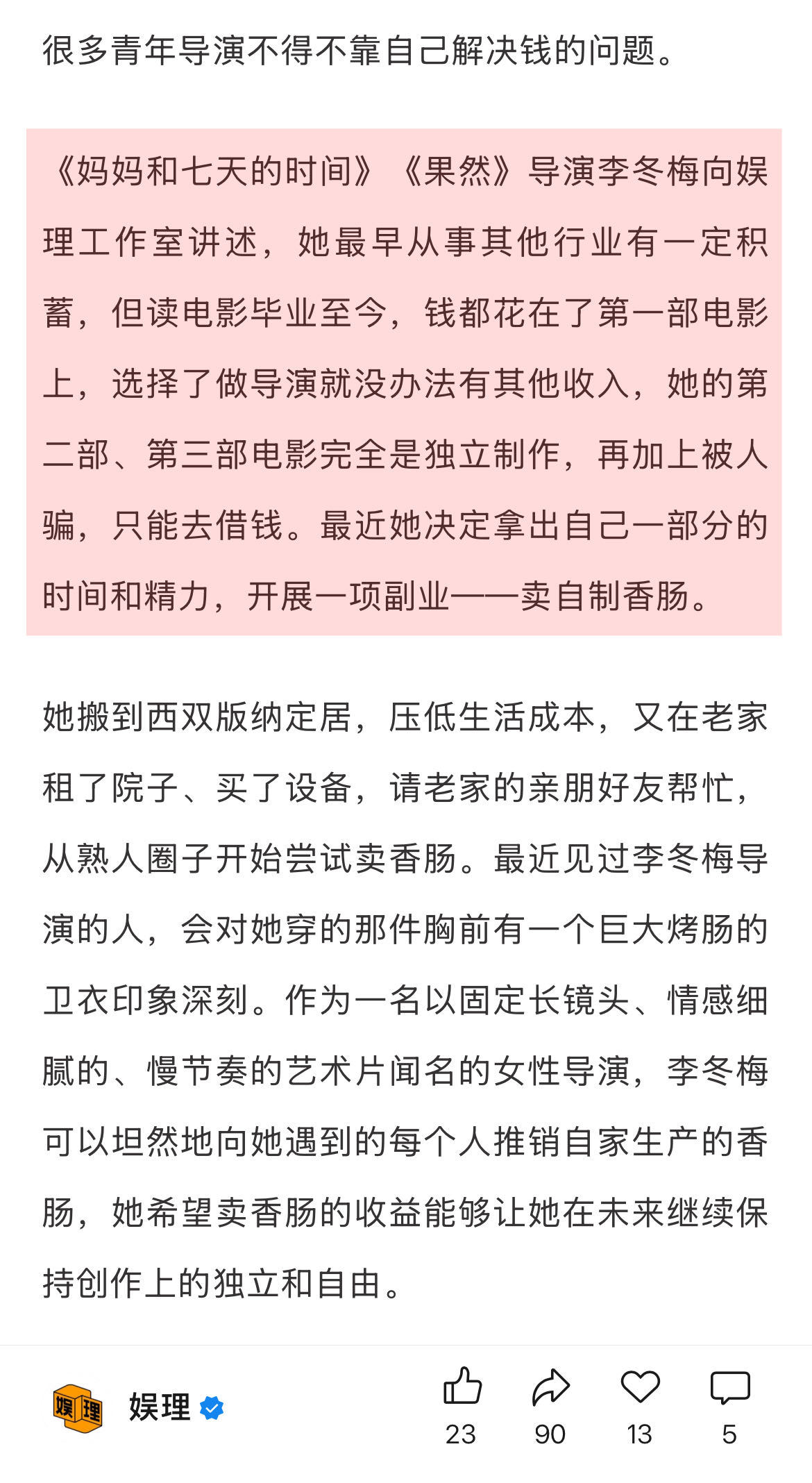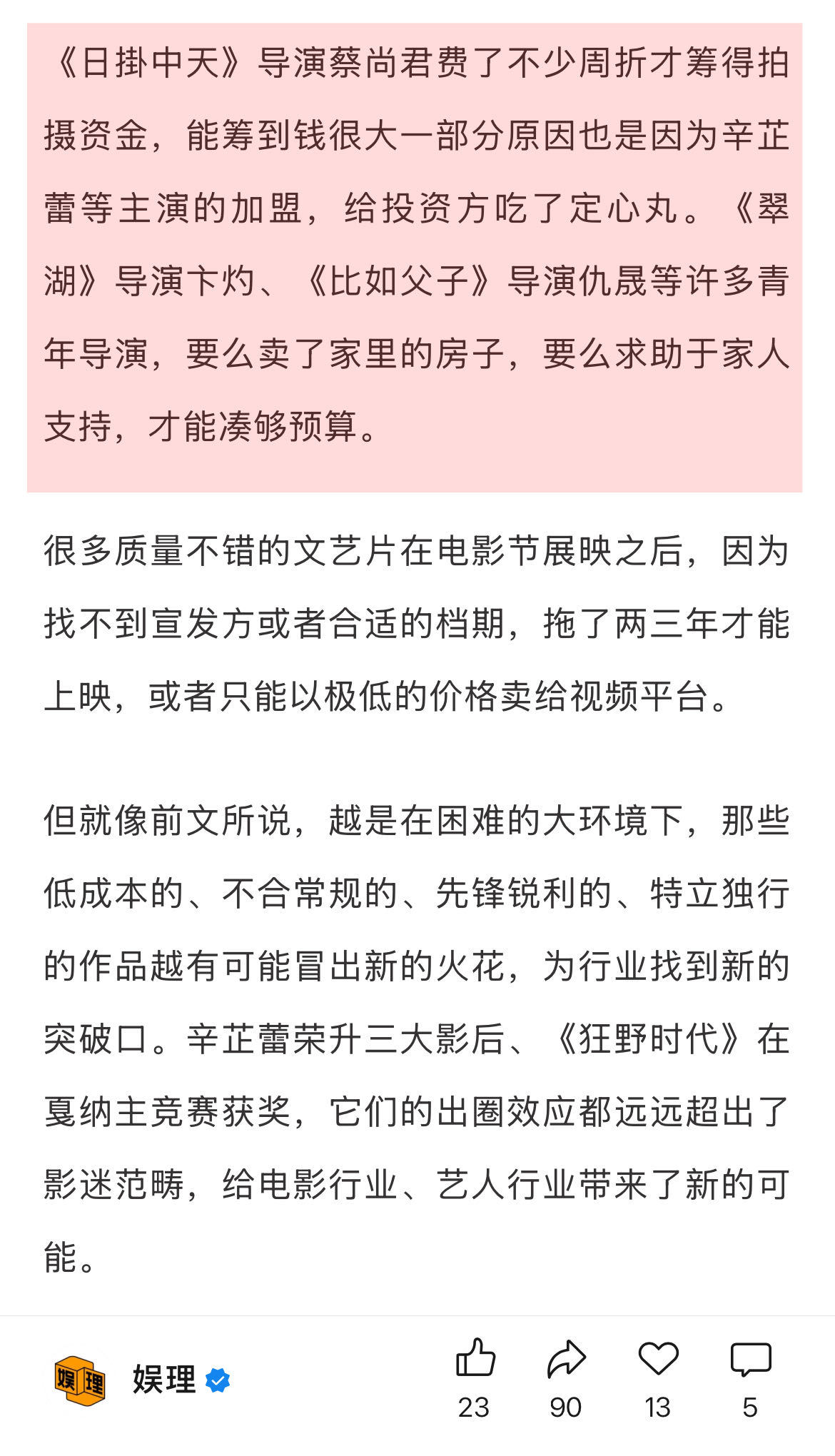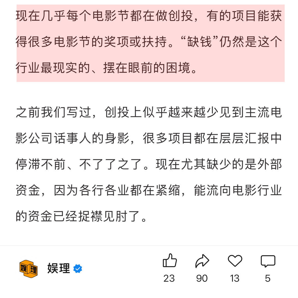 缺钱仍是电影行业最现实的困境电影节能助力电影宣发吗 有业内人士向表示,当前的确有许多大大小小的影节展在各地落地的过程中。相比其他实体经济,举办一个小规模影展的总投入不算高,又能借助电影的影响力达成文化艺术、文旅等方面的实绩。9月是下半年天气最好的时节,电影节撞车也是必然的。娱理独家↓