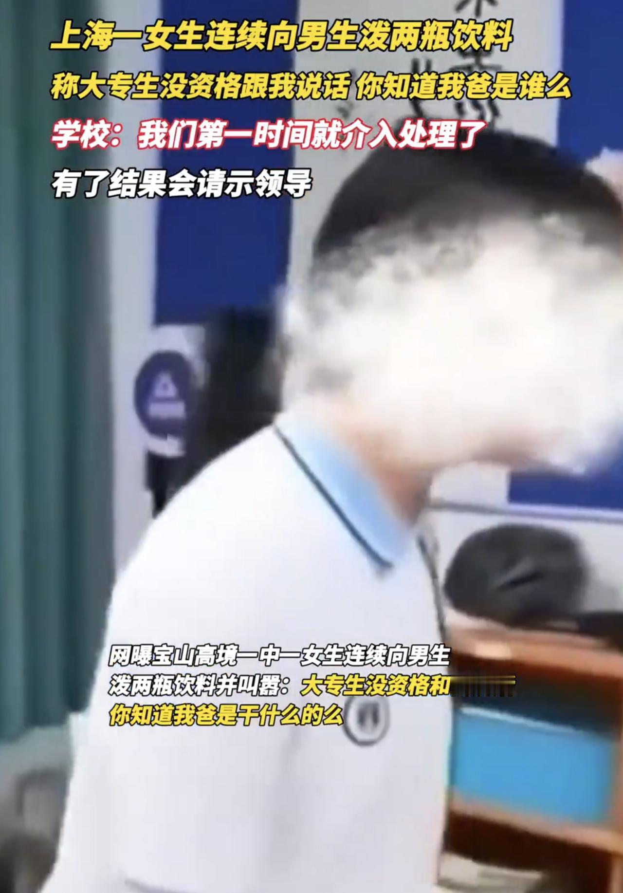 上海这女生真狂啊[灵光一闪]!看了她欺负男同学的视频,血压都要上来了。这女生光天化日,敢当众泼饮料羞辱男同学,还嚣张的说:"我考试分数比这你高30分,知道我爸是做啥的吗"?泼了一瓶饮料还嫌不够,她又开了瓶可乐继续浇男生。 这男生起初一句不吭,可再好的脾气,也架不住这么羞辱啊!最后忍无可忍,冲上去勒住这女生脖子[赞],却被几个男生拉住了,男生被泼饮料时,这几个男生和其他人不去阻止[笑哭]。 可男生还手时,几个男生跳出来拉偏架?我看这全班几十号人,没一个有正常的是非观。这女生老爸是谁呀?让她这么嚣张!你对这事又怎么看呢[灵光一闪]? 社会新闻