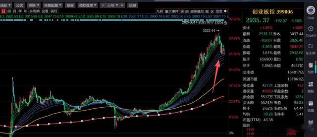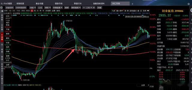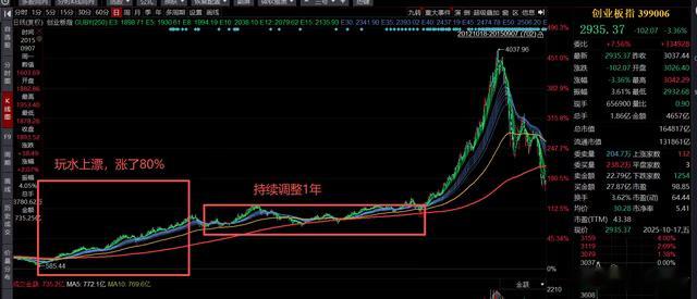 以创业板为例,今天跌了3.66%,10月10日那天还跌了4.55%。然而,现在也才刚刚跌进长期均线组中。如果市场很强势,那么就会踩着长期均线组上沿玩水上漂。如果市场较弱,就会在长期均线组中游几个来回。如果市场泄气了,就会跌穿长期均线组,向无穷成本线去寻找支撑。2019年的调整,就有一个跳空的大阴线,单日跌幅近8%。所以今天这种调整只是小场面而已。你得知道牛市长啥样,才不会过度恐慌。2013年,创业板一口气涨了80%,在这个过程中,一直都在玩水上漂,完全不给加仓的机会。然后就是长达1年的持续震荡。这才向下到无穷成本线去找支撑。