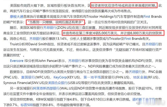 一、美国地区性银行爆发信用风险昨晚,ZION银行和Western Alliance银行都宣称自己遭到了信贷诈骗,ZION银行计提了5000万美元的坏账。