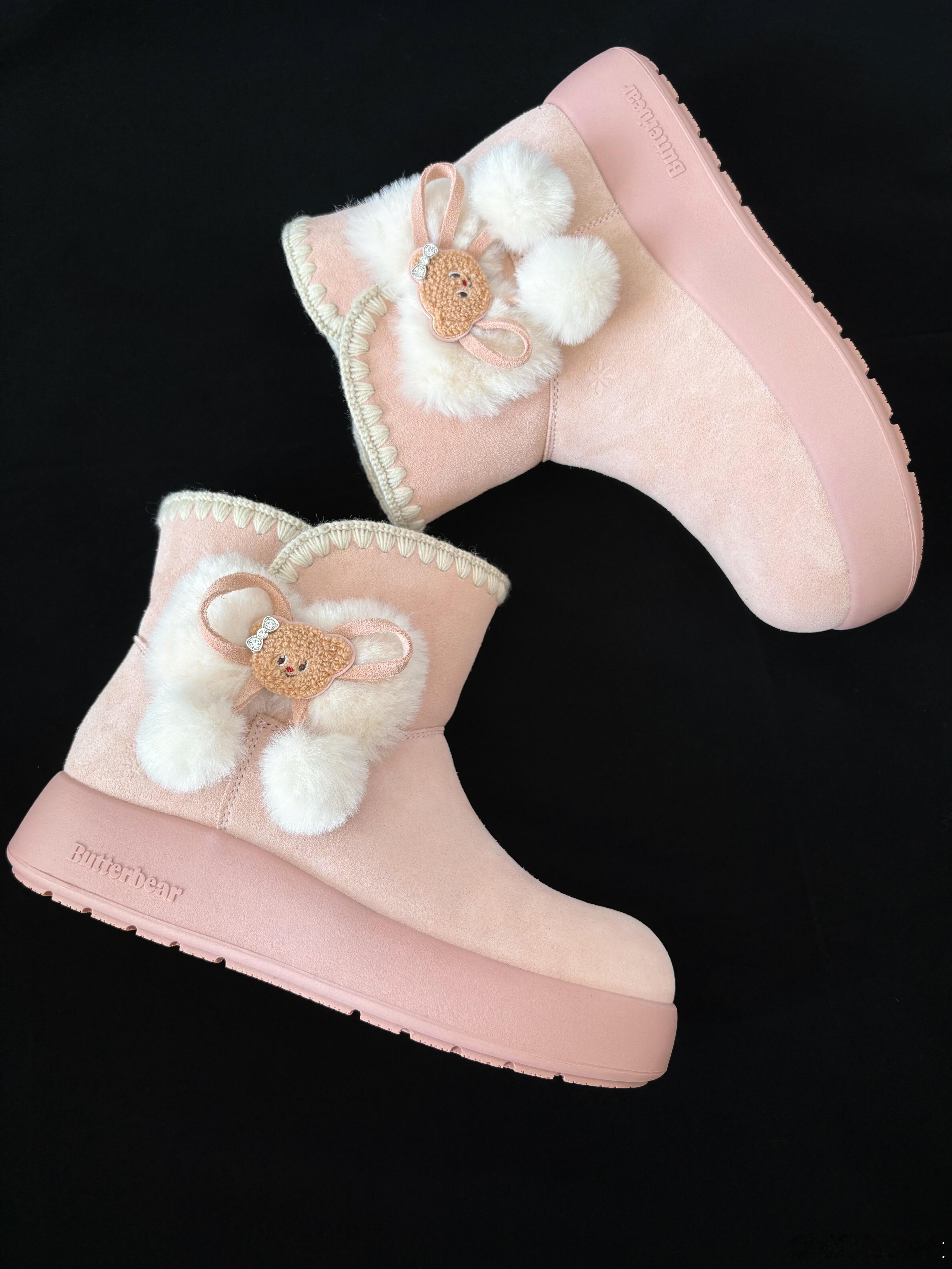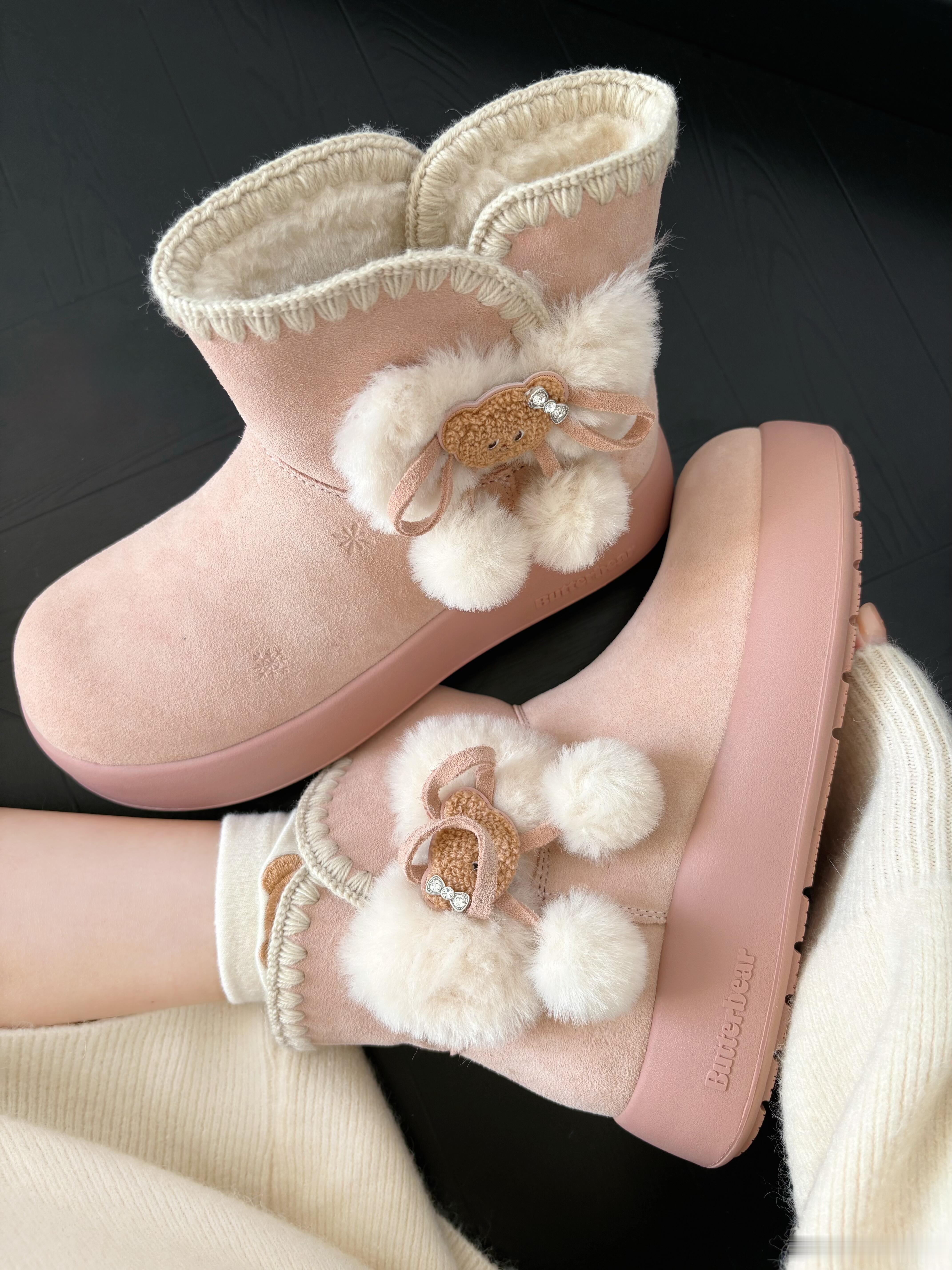 这双Butterbear粉色雪地靴,是冬日甜美风的完美诠释。鞋身采用柔和的粉色反