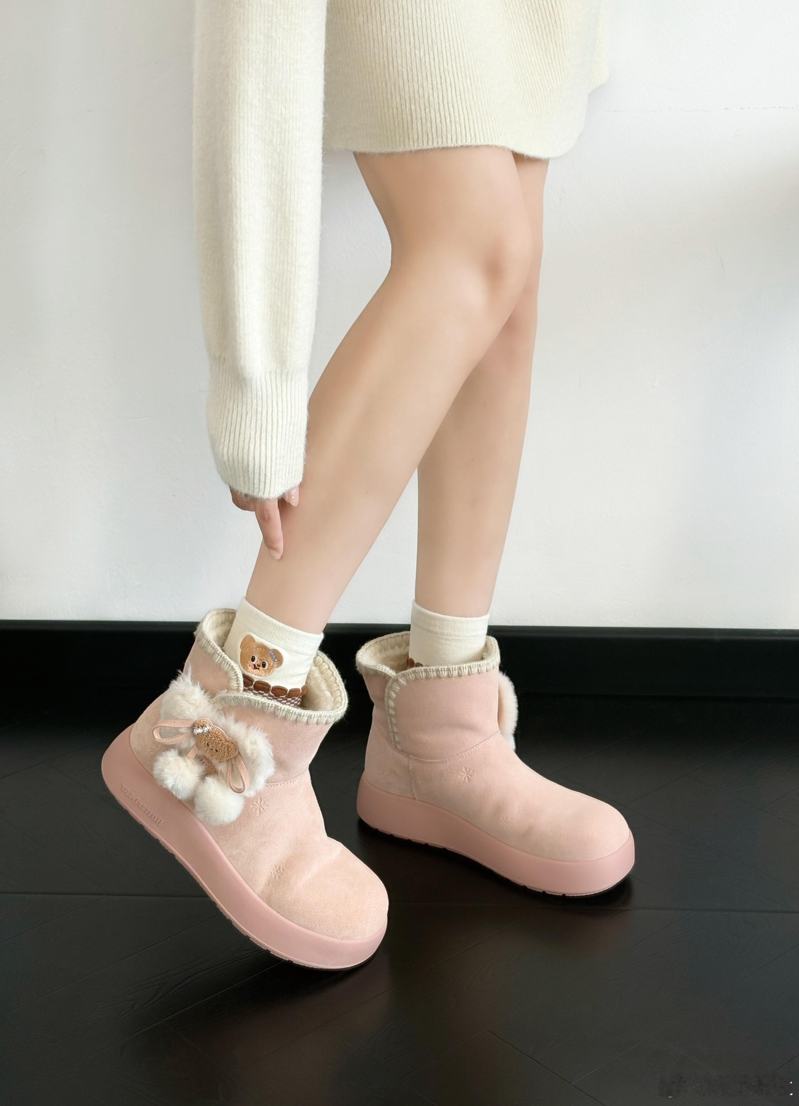 这双Butterbear粉色雪地靴,是冬日甜美风的完美诠释。鞋身采用柔和的粉色反毛皮材质,搭配鞋口一圈蓬松的白色毛绒装饰,不仅带来极致温暖,更营造出软萌可爱的氛围。侧面的立体蝴蝶结是设计亮点,其上点缀的闪亮水钻与两个白色毛球相映成趣,尽显俏皮与精致。厚实的鞋底在提供良好保暖与防滑性能的同时,也巧妙地拉长腿部线条。整体设计将少女感与实用主义巧妙结合,是冬日穿搭的点睛之笔。时尚鞋履