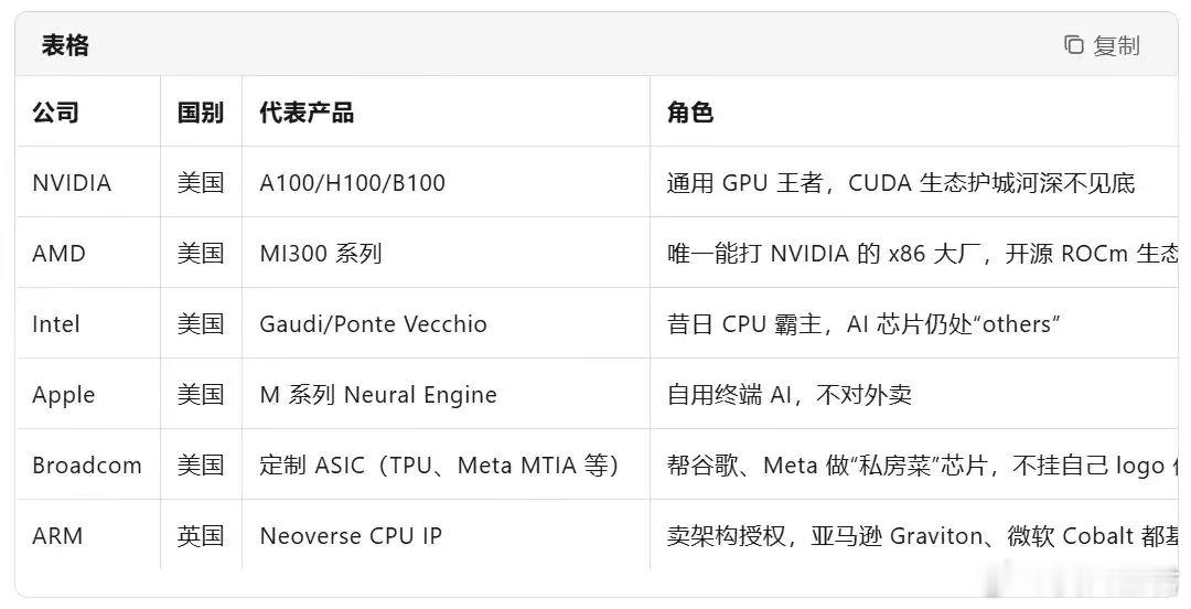 一句话总结:训练端 NVIDIA 一家独大,推理端 AMD+定制 ASIC 抢份额,ARM 是“幕后卖 IP 的房东”。