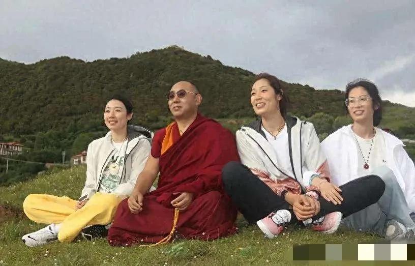 画面中的朱婷齿如珠贝,笑靥如花;身旁的妹妹朱佳荟不但与姐姐外貌相似,就连笑容也是复制;最左侧的姚迪喜容绽放,梨窝精致;那位戴墨镜的高僧是新甲旦真吗?