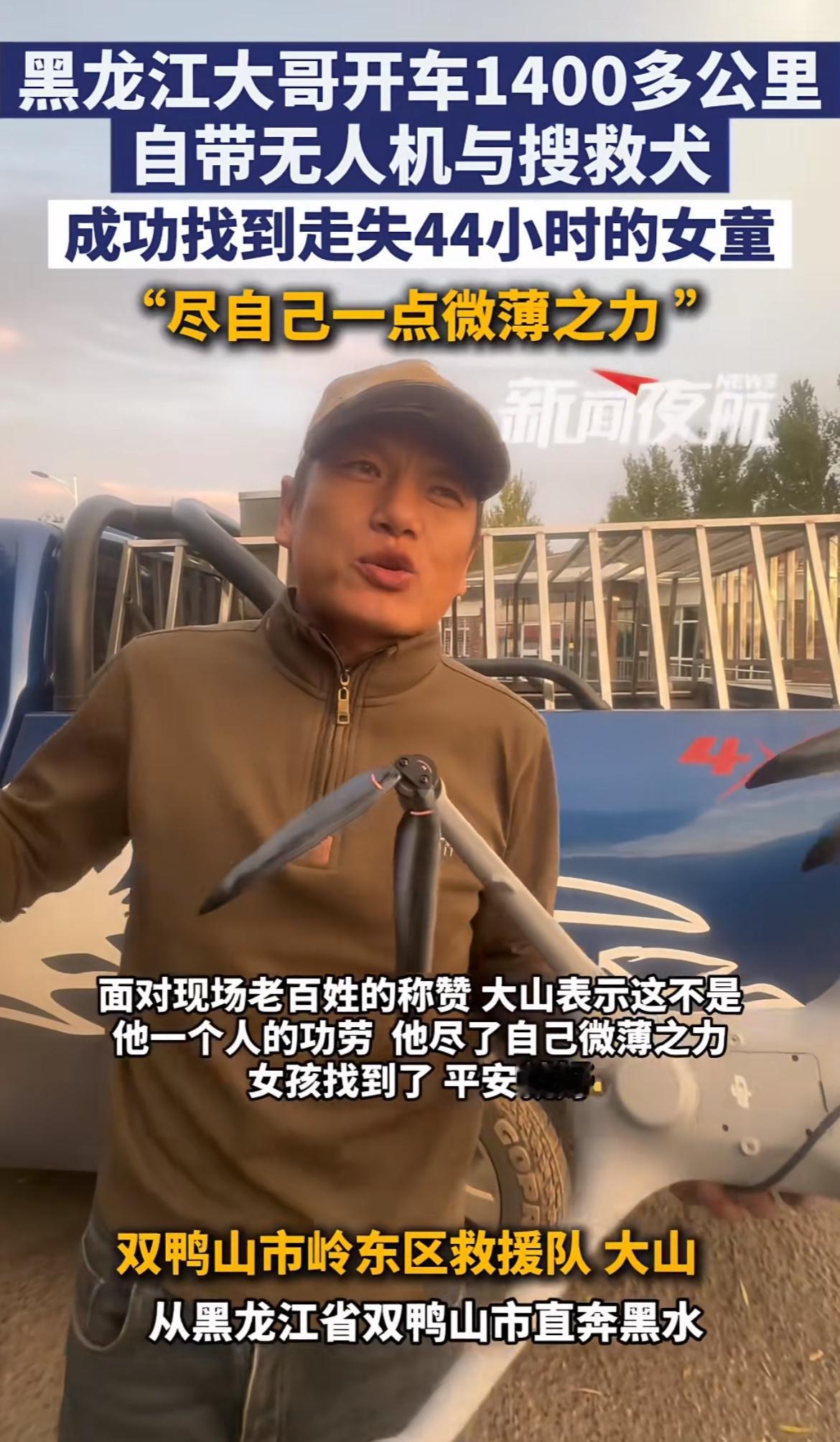 是他找到了失踪的孩子! 他拒收10万赏金! 昨天黑龙江双鸭山市使用无人机寻找失踪孩子时找到了孩子,这位大哥表示,找到孩子是最大的喜事,很多人都不抱希望能活着找到他。 大哥认为,孩子能活着回来,是对大家的莫大喜事。牵动14亿人心的事情,总算可以放下心来了。大哥说自己跑了1000多公里,没觉得白费,一方有难,八方支援,不是空话,而是实话,东北人的豪爽性格也在这里展现无遗。 真是要感谢这位大哥,这么冷的天要是再晚一天找到真的后果不敢想[捂脸]给这个大哥点赞[鼓掌][鼓掌][比心][赞]