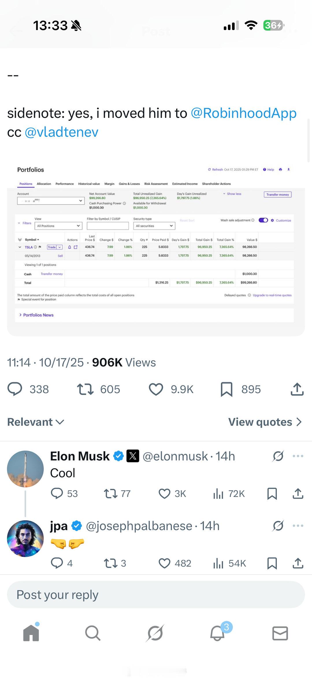 生活继续——我忙于其他事情,理所当然地以为投资已经搞定。几年后,我问起这件事,他却记不清细节了。他没用etrade干过别的,也不太确定是否真的下了单。Tesla和Elon那时已家喻户晓。这事在我们家成了个搞笑的梗——我们错过了Tesla。