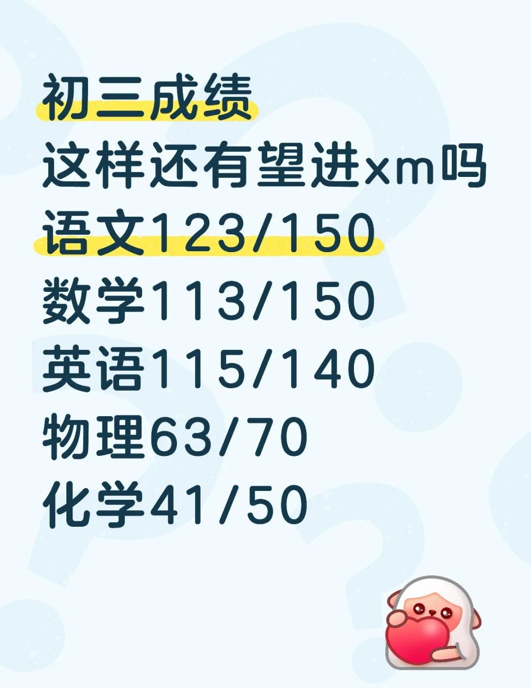 初三生真心发问。。 梦校xm 这个成绩年排在35%左右 这次除了语文物理其他学科发挥的都不太好 英语属于是严重发挥失常了 作文分别是49/60和16/20 求助学长学姐我有可能进xm么qwq 初三 上海中考 学习焦虑