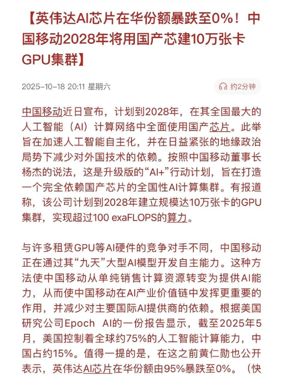 周末,半导体相关利好挺多… 英伟达AI芯片在华份额暴跌至0%,中国移动2028年将用国产芯建10万张卡GPU集群!但周一最好继续砸,下杀出恐慌盘后再拉,这样主力有了带血的筹码才想创新高。股市是零和博弈,主力赚散户的钱,而散户想赚钱,只能赚另外一个散户的钱,赚不了主力的钱。