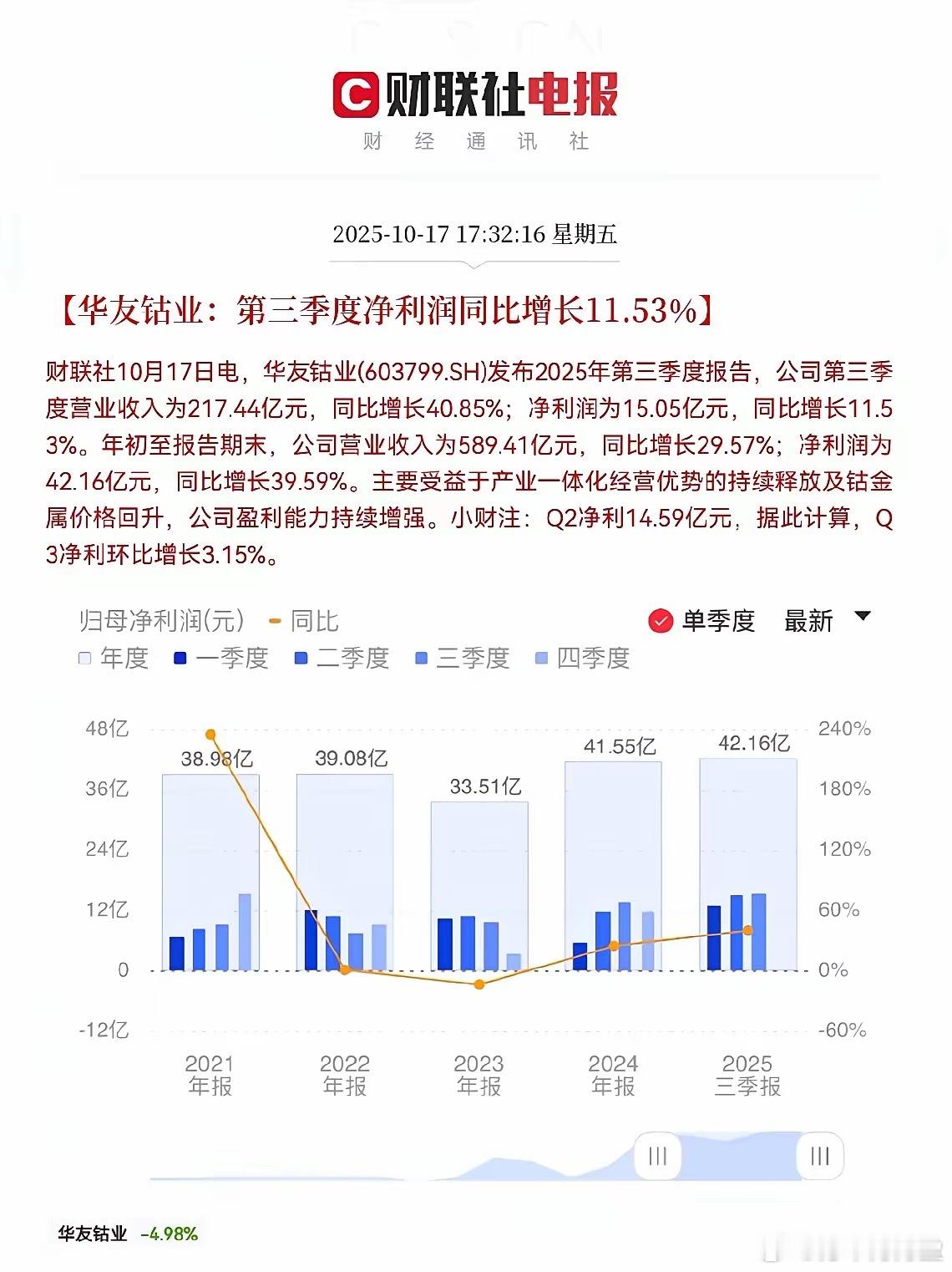 昨天华友钴业的三季报也出来了,营收589.4亿,同比增长29.57%,归母净利润42.16亿,同比增长39.59%,业绩增速完全符合预期,三季报里面除了业绩保持稳定增长外,最大的亮点是大牛散章建平重仓买进了1850万股,已经买进了公司第五大股东,这是公司三季报里最大的利好,熟悉章盟主的都知道,他的持股风格都是以中长线投资为主,刚刚新进的华友钴业,如果没有吃到大肉他是不会轻易收兵的,就像最近的两个成功案例,海南华铁和寒武纪,章盟主可都是吃大肉了!再叠加华友钴业长期盈利能力的不断提升业绩不断增长,未来的空间巨大。