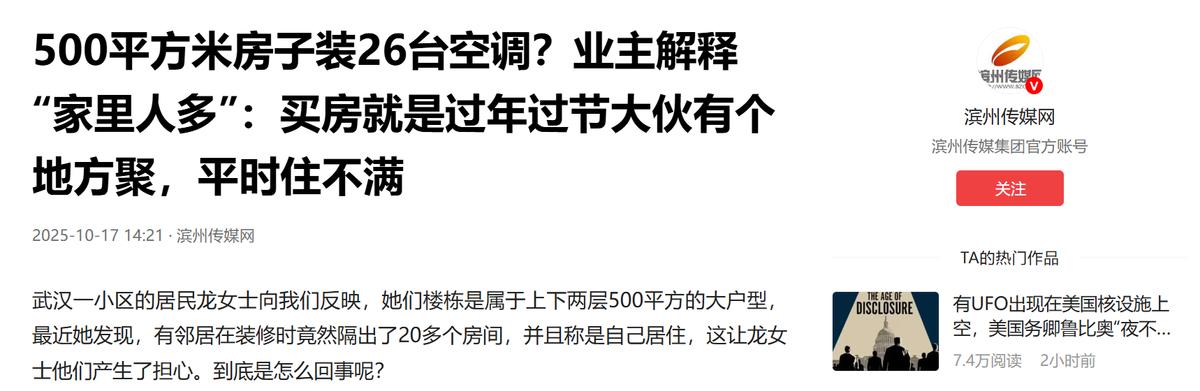 “解释不清了!”近日,湖北武汉,一男子在高端小区购买了500平米的大复式,没想到却在里面安装了26个空调,甚至还有19个马桶,周围的邻居纷纷担心不已,男子却表示他的手续齐全且有检测报告?网友:这得有多少个亲戚才能住的满啊。 这小区算是高端楼盘,能住这儿的都图个清净,可 7 楼那户 500 平米的大复式一装修,整栋楼的邻居都坐不住了,最先让人瞅着不对劲的是外墙,密密麻麻挂了 26 台空调外机,远远望去跟排着队似的,再后来又有人发现,施工现场堆过 19 个马桶,屋里更是隔出了 25 个房间,这配置一露出来楼里的议论就没停过。 业主是位王姓大哥面对邻居的疑问,他说得挺实在,家里人多三四个兄弟姐妹,加上各自的小家和老人,逢年过节得有地方团聚,隔这么多房间就是为了自家人住,至于装 26 台分体空调,是觉得中央空调费电,平时房间空着用哪间开哪台更划算。 可这话听在邻居耳朵里,实在没法让人信服,楼下的住户私下里算过,25 个房间配 26 台空调,就算每家亲戚都来,得是多大的家族才能住满啊? 网上看热闹的人都忍不住调侃:“这亲戚团怕是得按连队算吧?” 更别说 19 个马桶了,普通家庭顶多两三个,这数量怎么看都像是为高密度居住准备的。 大家心里都犯嘀咕这哪儿是自住房,分明是要改民宿或者群租房吧?任王大哥怎么解释,邻居们都觉得这事儿根本说不通。 就算先不猜动机,光这 26 台空调外机就够让人头大的,懂行的邻居说,一台空调外机运行起来噪音就得 50 到 70 分贝,可国家规定居民区白天不能超 55 分贝,夜里更是得低于 45 分贝,这 26 台要是一起开,那轰鸣声简直不敢想,长期待在这种环境里,失眠、烦躁是早晚的事,家里有老人小孩的更是愁得不行。 担忧还不止噪音。26 台空调同时运转,楼里的电路能扛得住吗?万一真住进来一大家子人,小区本就紧张的停车位、日常的垃圾处理,压力得多大?王大哥拿出过第三方报告,说没动承重墙,也没改开发商原配的 6 个卫生间下水系统。 可邻居们心里还是打鼓,原配管道设计哪经得起 19 个马桶的使用强度?真堵了漏了,楼下的房子不就遭殃了? 其实这事儿从去年就有邻居投诉了,中间还停工过一阵,最近又重新施工了,社区跑了好几趟协调,王大哥终于松口说会把空调外机挪得离邻居窗户远点,可这让步到底管不管用,谁也没底,外机还在那儿,房间数量也没减,该担心的照样担心。 最让人无奈的是,王大哥手里的手续全得挑不出错,装修协议、房屋安全鉴定报告样样齐全,城管、消防、住房和城市更新局上门检查,都没说不合规,相关部门也犯难,法律上还真没理由强制叫停,可一张合规证明,根本抹不平邻里间的隔阂。 现在的监管都盯着承重墙、下水管道这些硬指标,可噪音污染、居住密度这些影响生活品质的 “软伤害”,根本没有提前约束的办法,社区能做的也只是在规则缝里来回调解,根本解决不了根本问题。 眼下 7 楼的装修还在继续,那 26 台空调外机就挂在墙上,像个沉默的疙瘩,在城里住久了都明白,私人空间和公共安宁的边界得小心维护,可真遇到这种手续合规但处处添堵的事,除了犯愁也没别的办法。 (信息来源:滨州传媒网——500平方米房子装26台空调?业主解释“家里人多”:买房就是过年过节大伙有个地方聚,平时住不满)