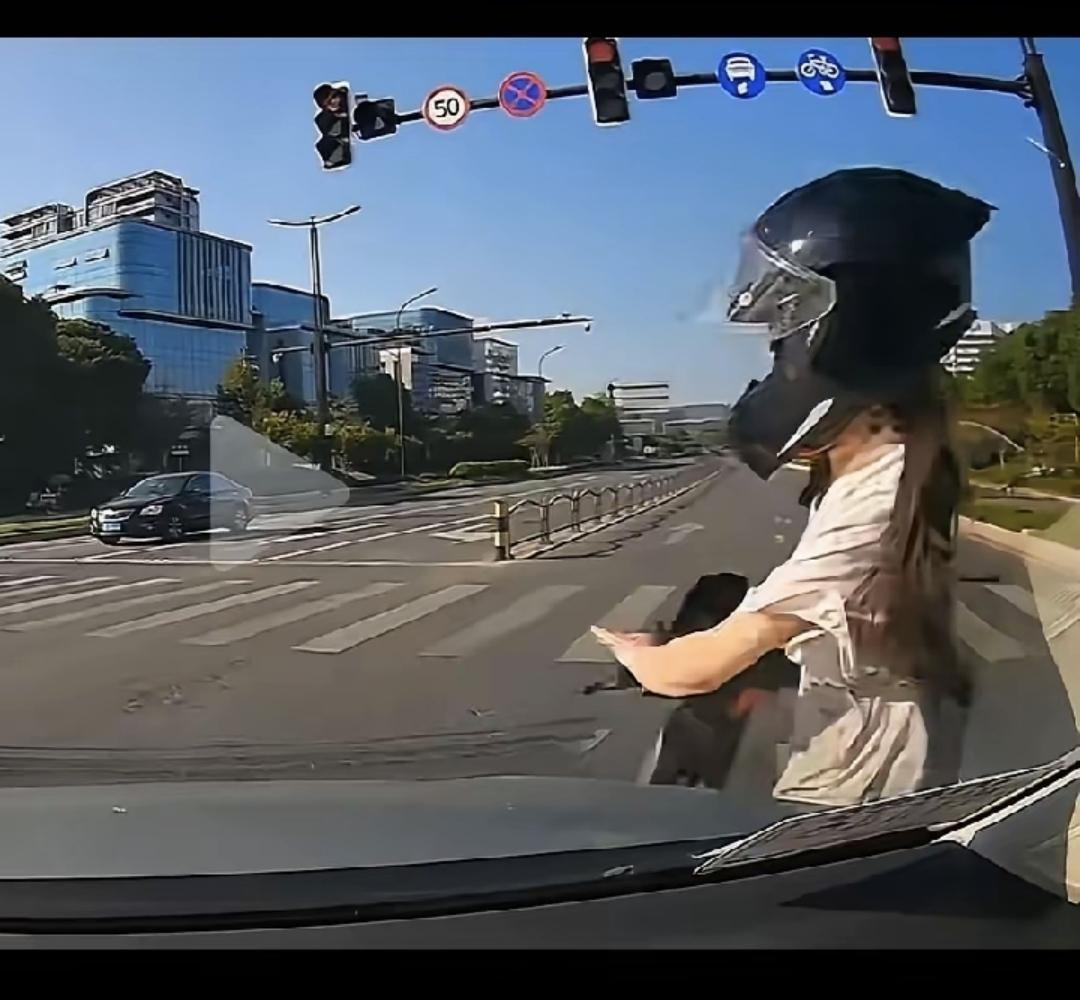 这是骑电动车姑娘被撞前一刹那的照片,证明姑娘当时是戴头盔的,可惜,在碰撞发生时,头盔从她头上脱落,显然当时没有系紧,这个看似不足挂齿的细节,险些酿成无法挽回的悲剧,也给骑摩托车出行的年轻人提个醒:完全无小事,切不可“一失足成千古恨”。 事故发生地点为一十字路口。当时一辆灰色轿车正常行驶。忽然,一位驾电动车的姑娘,从右侧窜出,试图从轿车前穿过,结果被轿车撞个正着。借助撞击产生的强大惯性,姑娘瘦削的身体被抛向空中,宛如一颗出膛的炮弹,射向空中,接着,一个倒栽葱,重重摔在马路上。 难以置信的是,摔倒在地的姑娘,居然挣扎着站了起来,踉踉跄跄奔向自己的电动车。表面看来,除了皮肤擦伤,姑娘身体似无大碍。但身体内部是否造成创伤,似乎一时难以断言。但愿姑娘有惊无险,安然无恙。