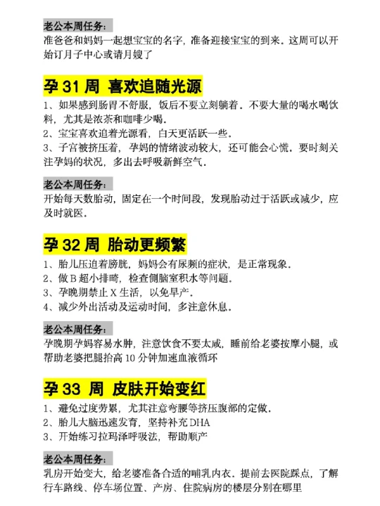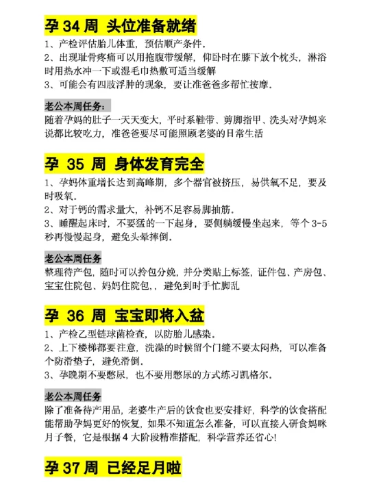 [樱花R]终于到孕晚期了,孕妈身体会变得更加不便,同时需要注意的事情也更多了,此时老公的关心和照顾尤为重要! 那孕晚期每周孕妈都有哪些注意事项,老公又要做些什么呢?[向右R]这里整理了一篇孕晚期和产后老公需要做的,赶紧- 另外需要注意的是,[飞盘R]不管是在孕期还是产后,饮食对于孕妈来说都很重要,特别是在月子期间,科学的饮食搭配能帮助孕妈更好的恢复![氛围感R]准爸爸可以在孕晚期的时候就和婆婆商量好谁负责做月子餐,月子里怎么吃,如果不知道怎么准备,[向右R]可以直接入研食妈咪月子餐 - 它是针对产后四大不同阶段定制的,28天粥汤不重样的组合,不仅饮食多样化还科学营养,[种草R]每包都是搭配好了的,直接加水加上喜欢的玉米山药肉类炖煮就可以了,像我老公这种不会做饭的,[害羞R]都能轻松搞定,主打一个省心方便! - 它的食材丰富,[樱花R]像月子汤里面融入了百合、芡实、阿胶、枣、枸杞、茯苓、莲子、黄精、桑葚、山药等珍贵食材,食材多大47种,富含钙、铁、维生素B1、烟酸等营养成分,不仅低脂还营养! - 月子粥里面也含有47种五谷杂粮,像百合、山药、木瓜、桂圆、芡实、枸杞、茯苓、黑芝麻等这些都是有的,[种草R]富含高膳食纤维! - [彩虹R]如果你还不知道宝妈坐月子吃啥怎么吃?准爸爸们赶紧跟老婆安排起来吧!最后祝各位孕妈顺利生产,产检一路绿