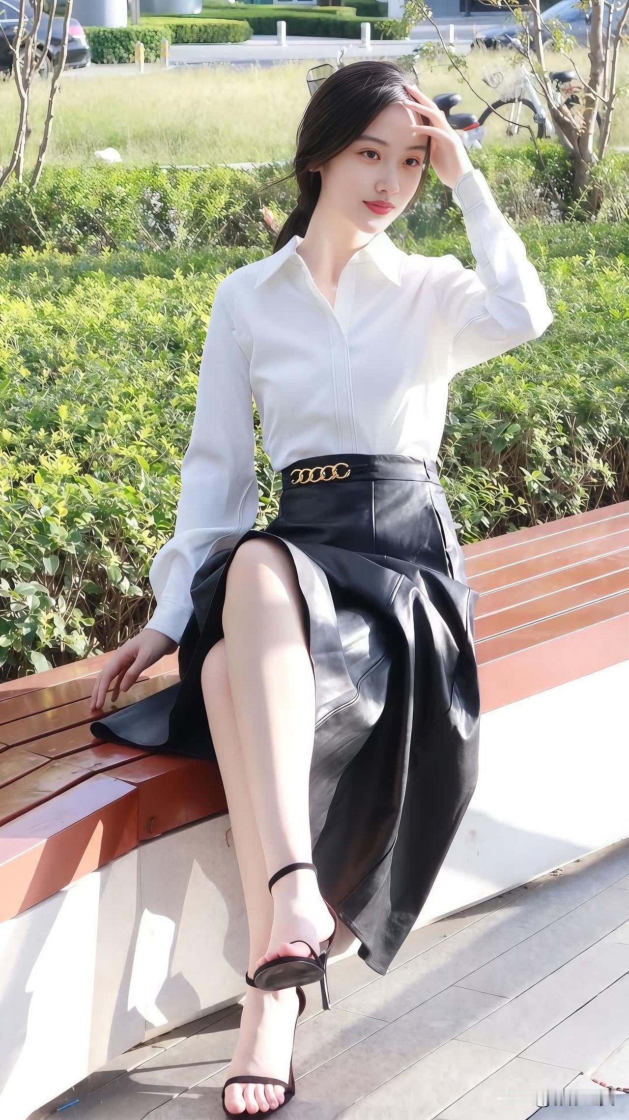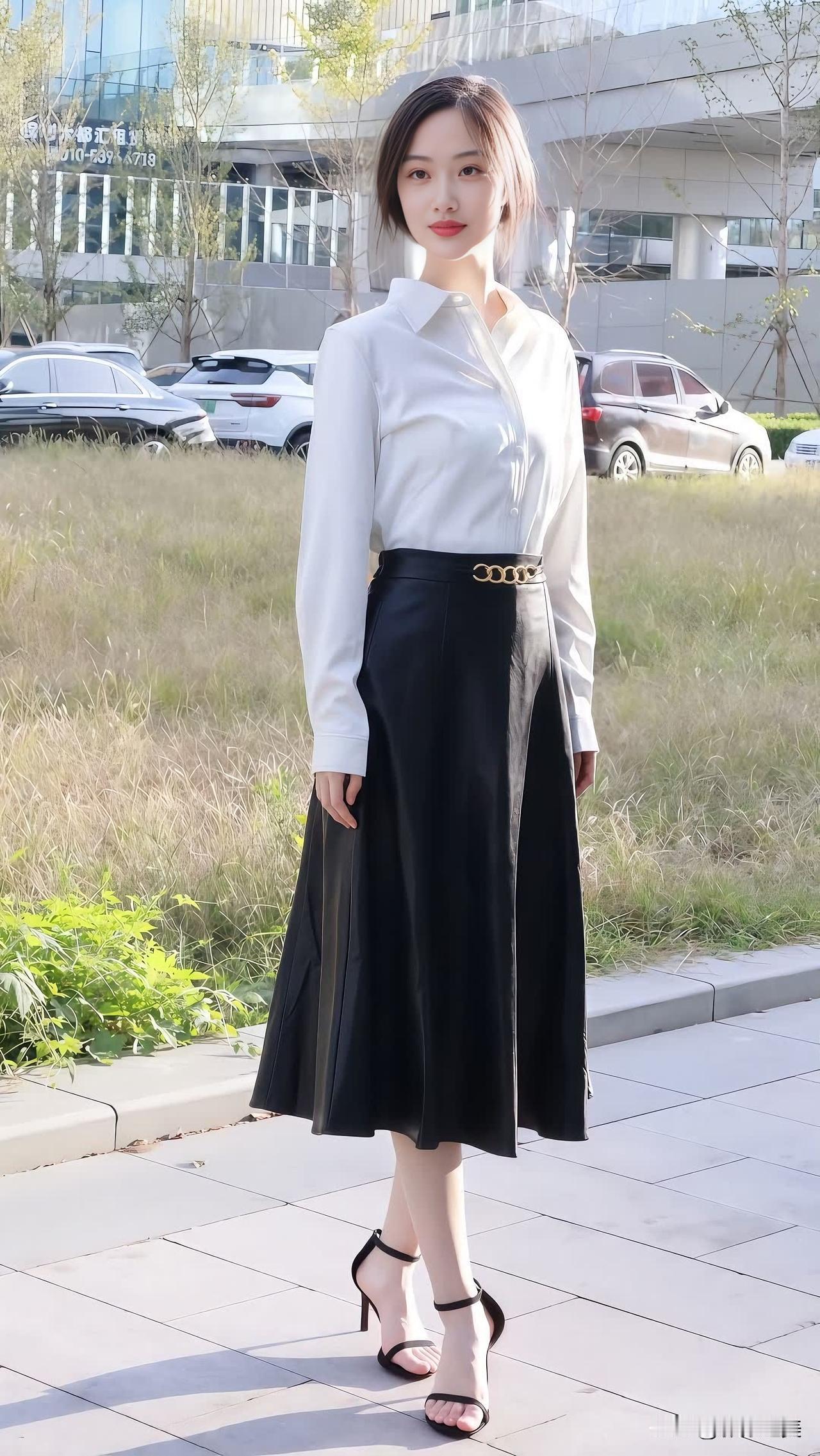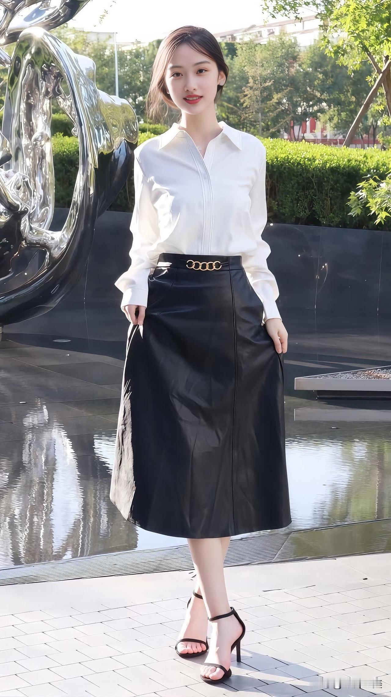 通勤风也能很时髦!白衬衫搭黑色皮裙,金属腰扣+细带高跟,简约又高级,职场穿搭这么穿绝了~