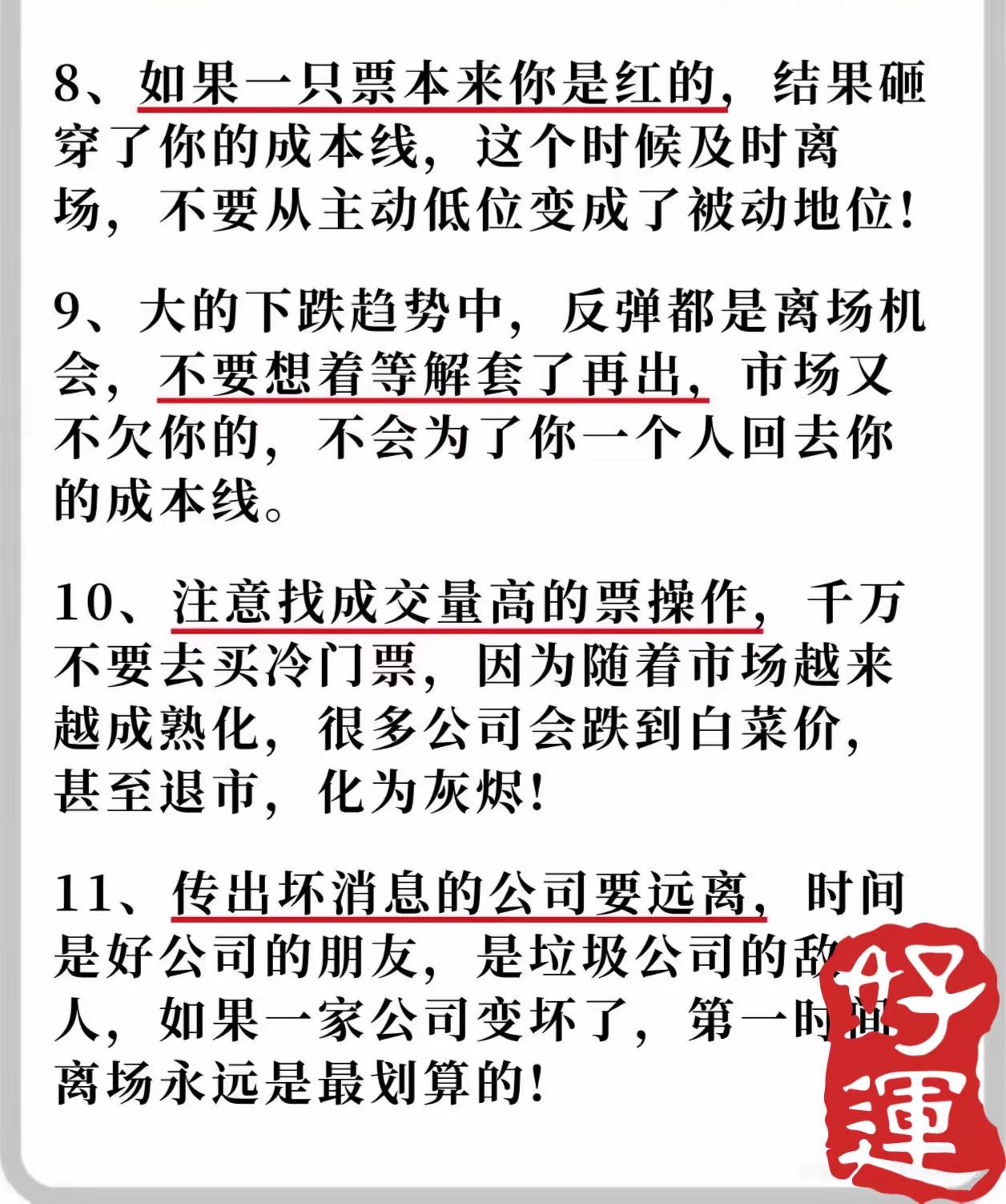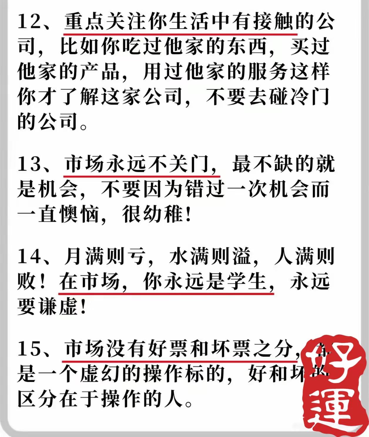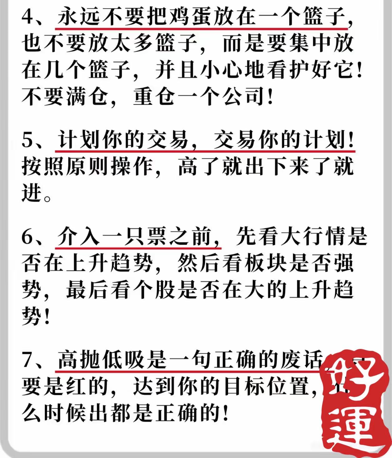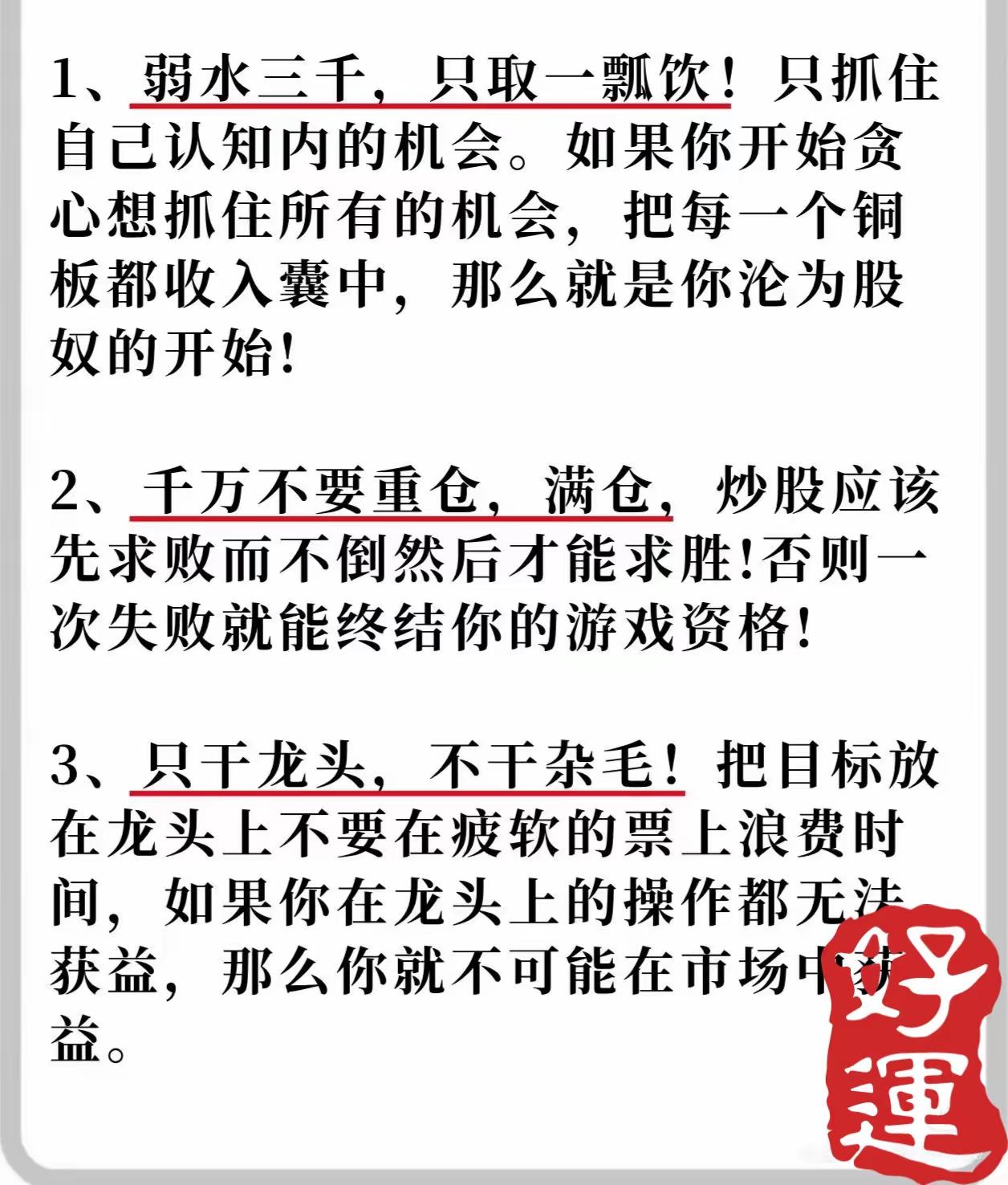 围绕“将炒股作为长期职业甚至养老手段”的核心目标,系统总结了15条股票投资经验,核心逻辑是通过严格的风险控制、聚焦核心机会、理性操作策略及长期心态管理,帮助投资者在市场中稳健生存并实现长期收益。具体内容可分为以下六大维度: 一、基础原则:聚焦核心机会,拒绝贪婪分散 - 只做认知内的机会(第2条1):强调“弱水三千,只取一瓢饮”,避免因贪心追逐所有机会而沦为“股奴”,需专注自身能力范围内的投资标的。 - 专注龙头股(第2条3):明确“只干龙头,不干杂毛”,龙头股是市场资金共识最强的方向,若连龙头操作都无法获利,则其他弱势票更难盈利。 - 适度集中持仓(第3条4):反对过度分散(“不要放太多篮子”)或过度集中(“不要满仓重仓一个公司”),主张将资金集中在少数经过筛选的标的上,并谨慎管理。 二、仓位与风控:先求不败,再求胜 - 避免重仓满仓(第2条2):强调“先求败而不倒,再求胜”,重仓或满仓会因一次失败终结投资资格,需保留足够安全边际。 - 严格止损纪律(第4条8/9):若持仓股跌破成本线(从盈利转亏损),需果断离场,防止从主动变被动;在下跌趋势中,反弹是离场机会,勿幻想解套,市场不会因个人需求回调。 三、操作策略:计划先行,尊重趋势 - 计划交易,交易计划(第3条5):要求提前制定交易规则(如高低位买卖点),并严格执行,“高了就出,低了就进”,避免情绪化操作。 - 顺势而为(第3条6):介入前需依次判断大行情(整体市场趋势)、板块强度(资金聚集方向)及个股趋势(是否处于上升通道),三者共振时成功率更高。 - 理性看待“高抛低吸”(第3条7):该策略本身正确但易成空话,若股价达到目标位置(如盈利预期或高位),无论红绿都应及时卖出,避免犹豫。 四、标的选择:警惕风险,贴近生活 - 避开弱势与负面标的(第4条10/11):避免参与成交量低的“冷门票”(易被市场淘汰甚至退市),远离传出坏消息的公司(垃圾公司随时间价值归零,第一时间离场最划算)。 - 优先熟悉的公司(第5条12):重点关注生活中有直接接触的公司(如消费过其产品/服务),这类公司更易理解基本面,避免碰触不了解的冷门标的。 五、心态管理:保持谦逊,接受市场常态 - 拒绝懊恼与执念(第5条13):市场机会永不缺位,错过一次无需懊恼,纠结于“错过”是幼稚行为,应保持开放心态等待新机会。 - 永远保持学习心态(第5条14):市场没有永恒的赢家,“月满则亏,水满则溢”,投资者需始终以学生自居,承认自身局限,持续精进。 六、本质认知:操作决定标的价值 - 无绝对好坏票(第5条15):市场不存在天然“好票”或“坏票”,同一标的因操作者能力差异可能产生不同结果,核心在于投资者自身的策略与执行能力。