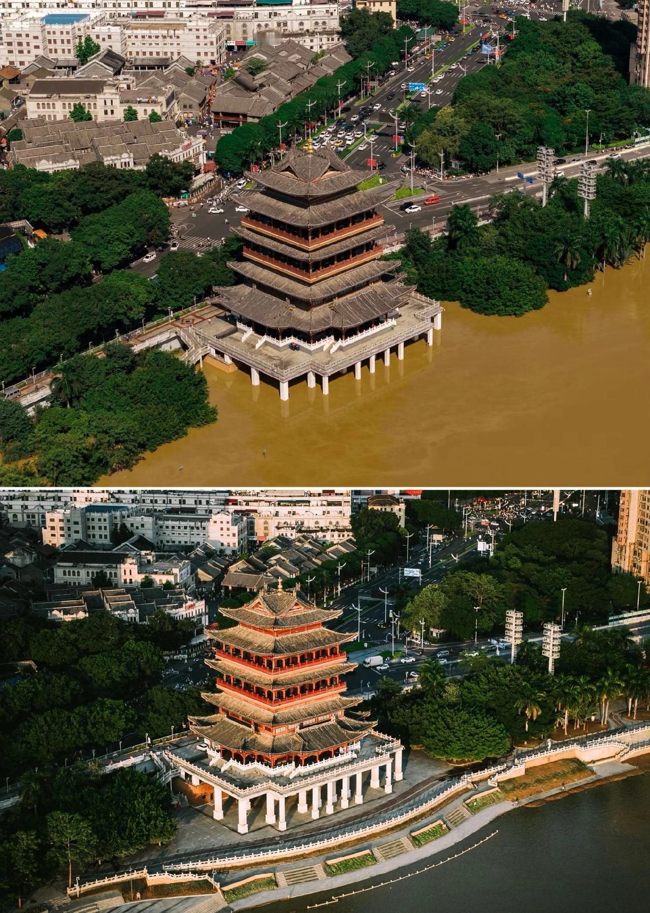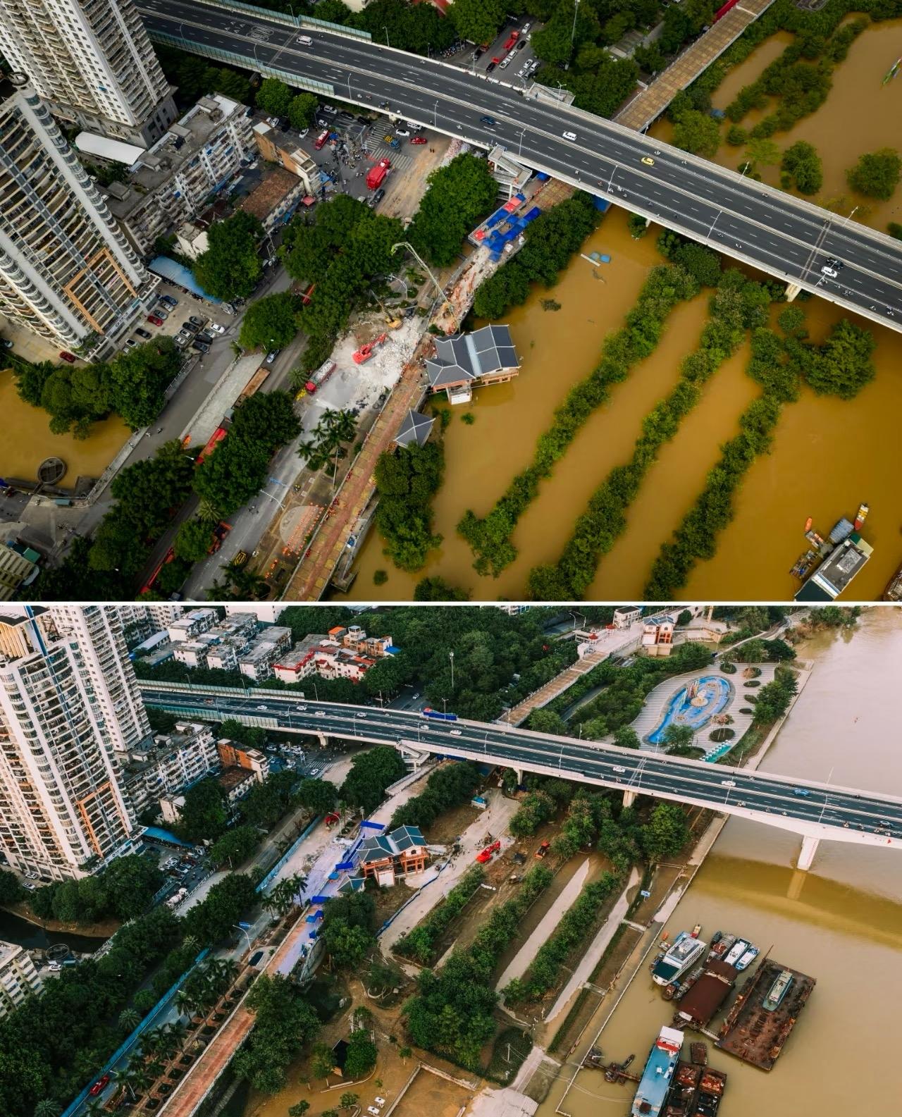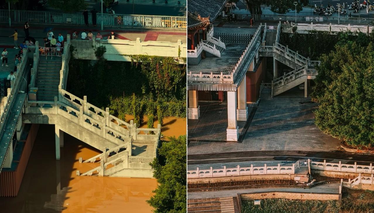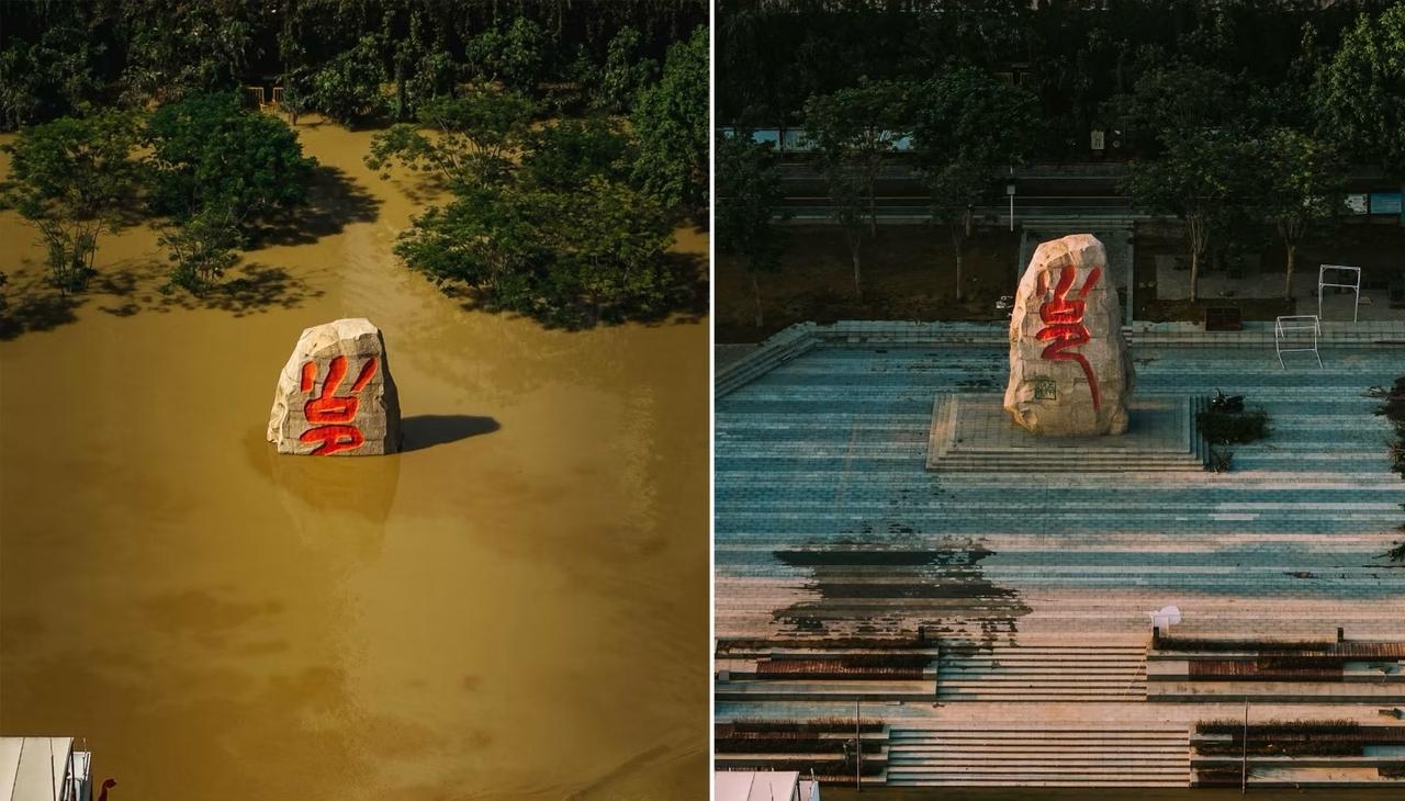 洪水退去,河岸恢复了往日的轮廓。 南宁洪水,10.4号洪峰水位和10.15号洪水退去后的对比。 洪水退去,城市重归宁静,唯有墙角的水痕,像一道淡淡的泪痕,无声地诉说着刚刚平息的故事。