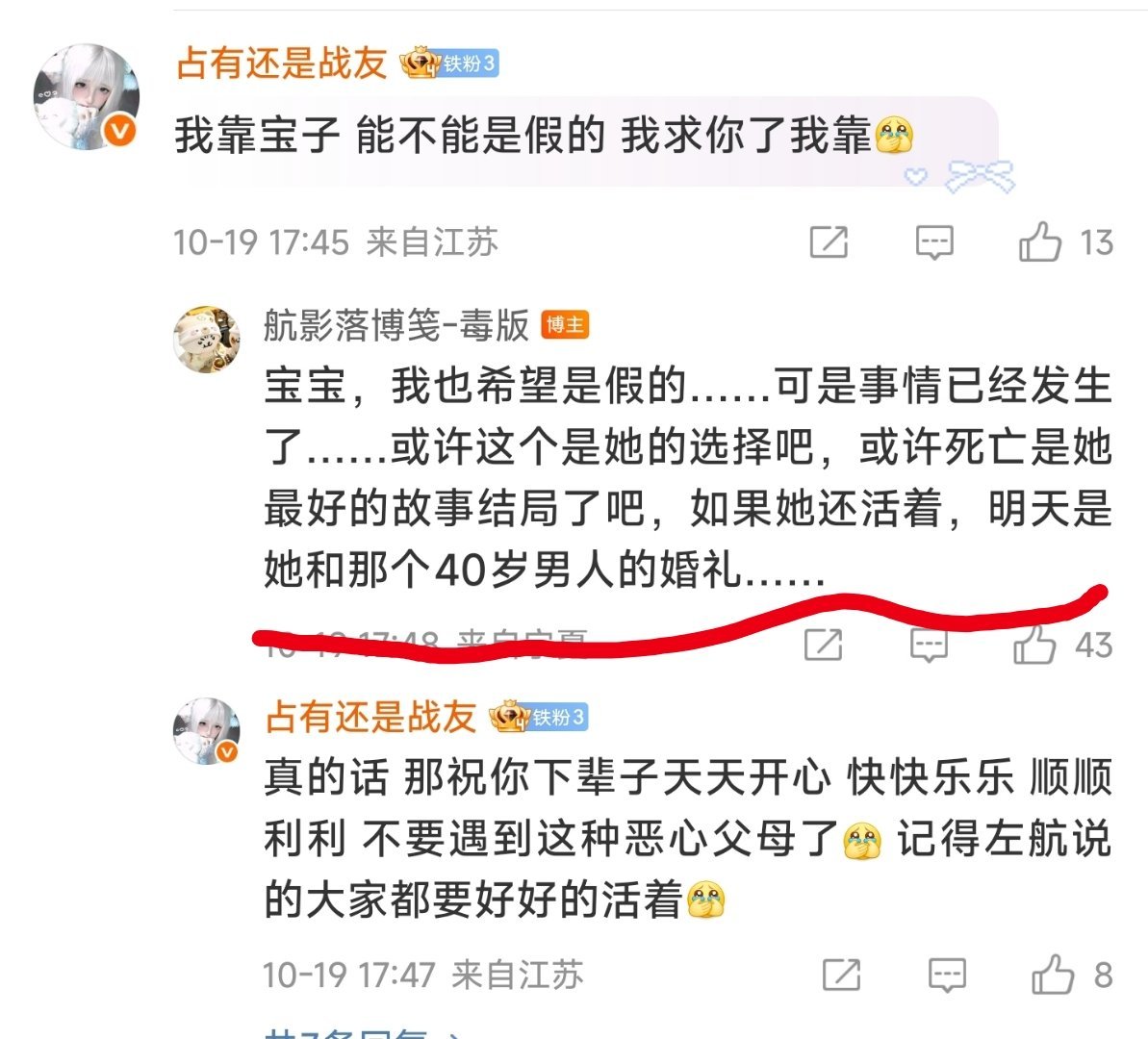 这个是左航粉丝,她的家人背着她给她定了一个40岁的老男人,还收了彩礼!而这个小姑娘才20多岁,为了反抗,逼的走了绝路,真的太心痛了!这个能不能追究她家人的责任?[苦涩]
