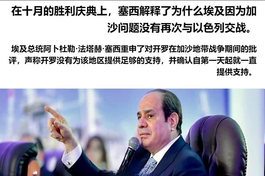 埃及总统塞西今天在纪念第四次中东战争52周年的研讨会上解释为什么埃及没有因为加沙问题再次与以色列交战,大致意思是说目前埃及的经济已经非常危险且严重依赖旅游业,哪怕只卷入战争一个小时,埃及的经济都将倒退数年。