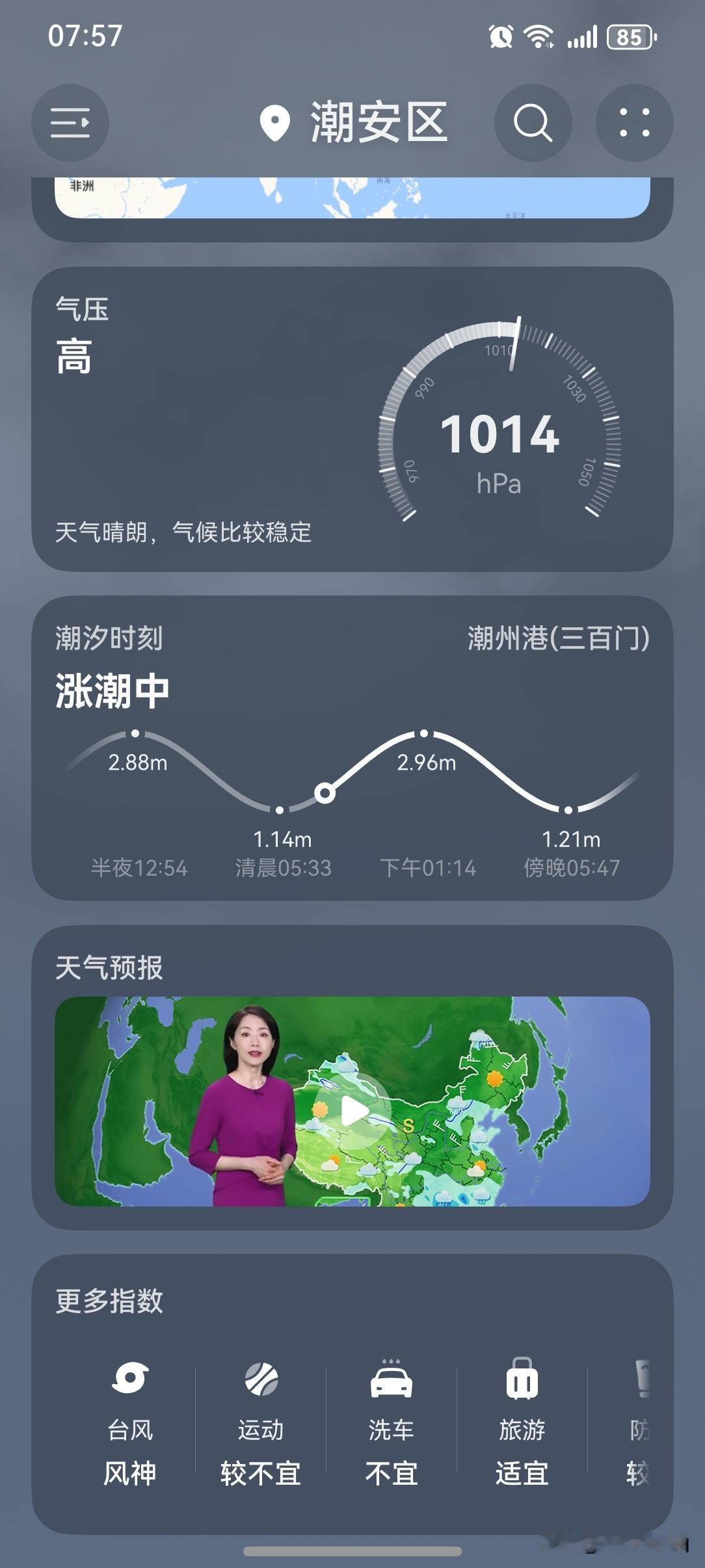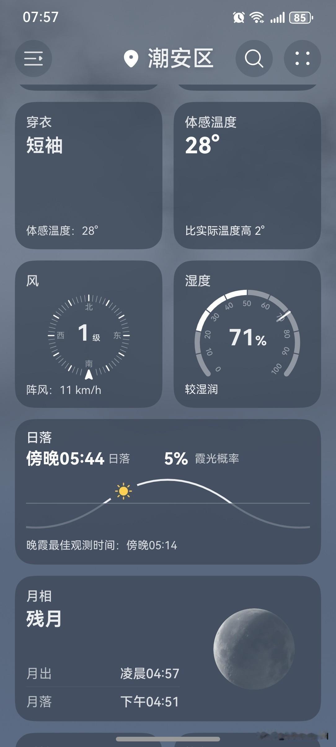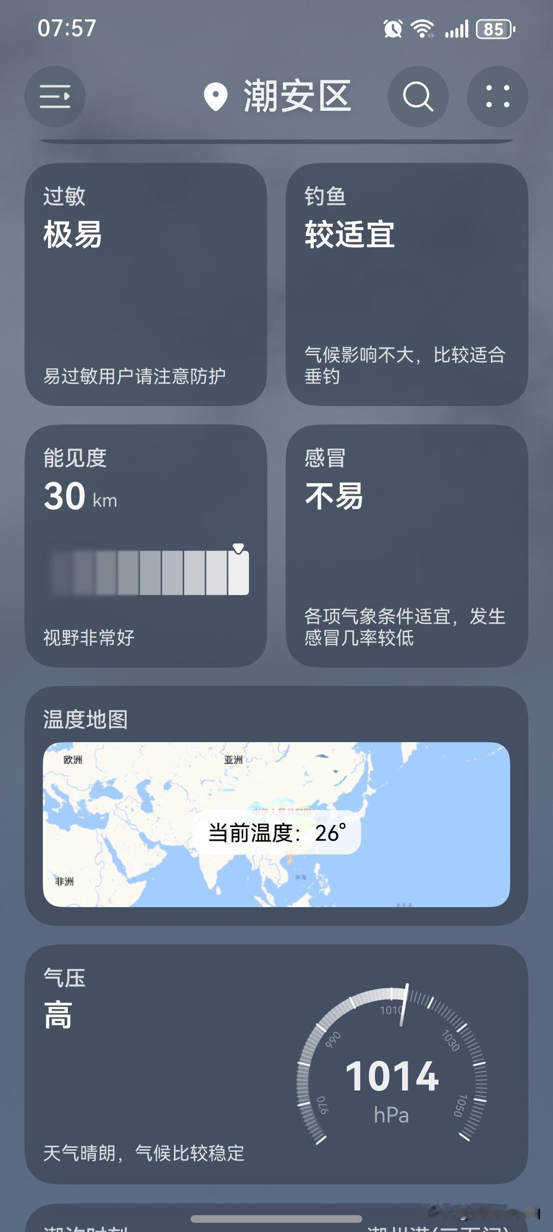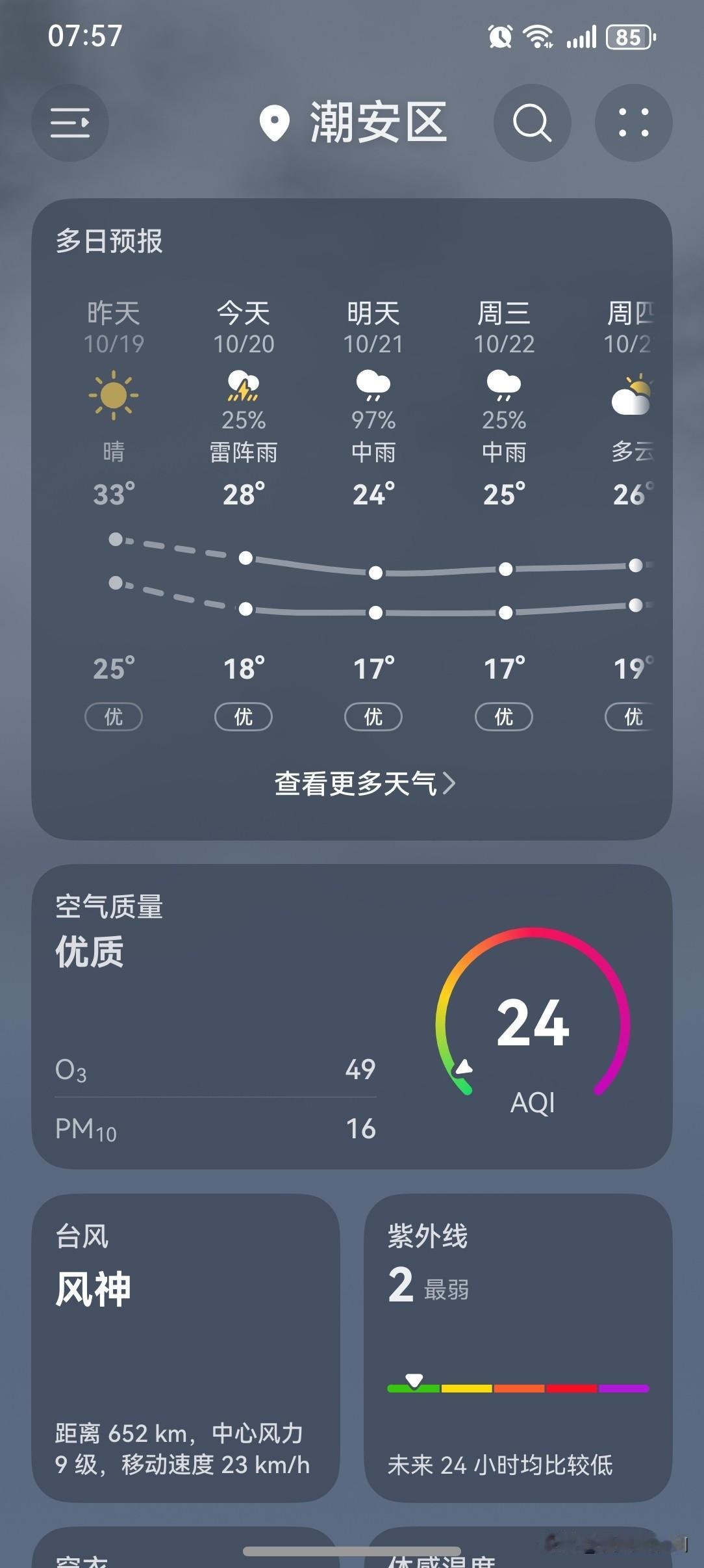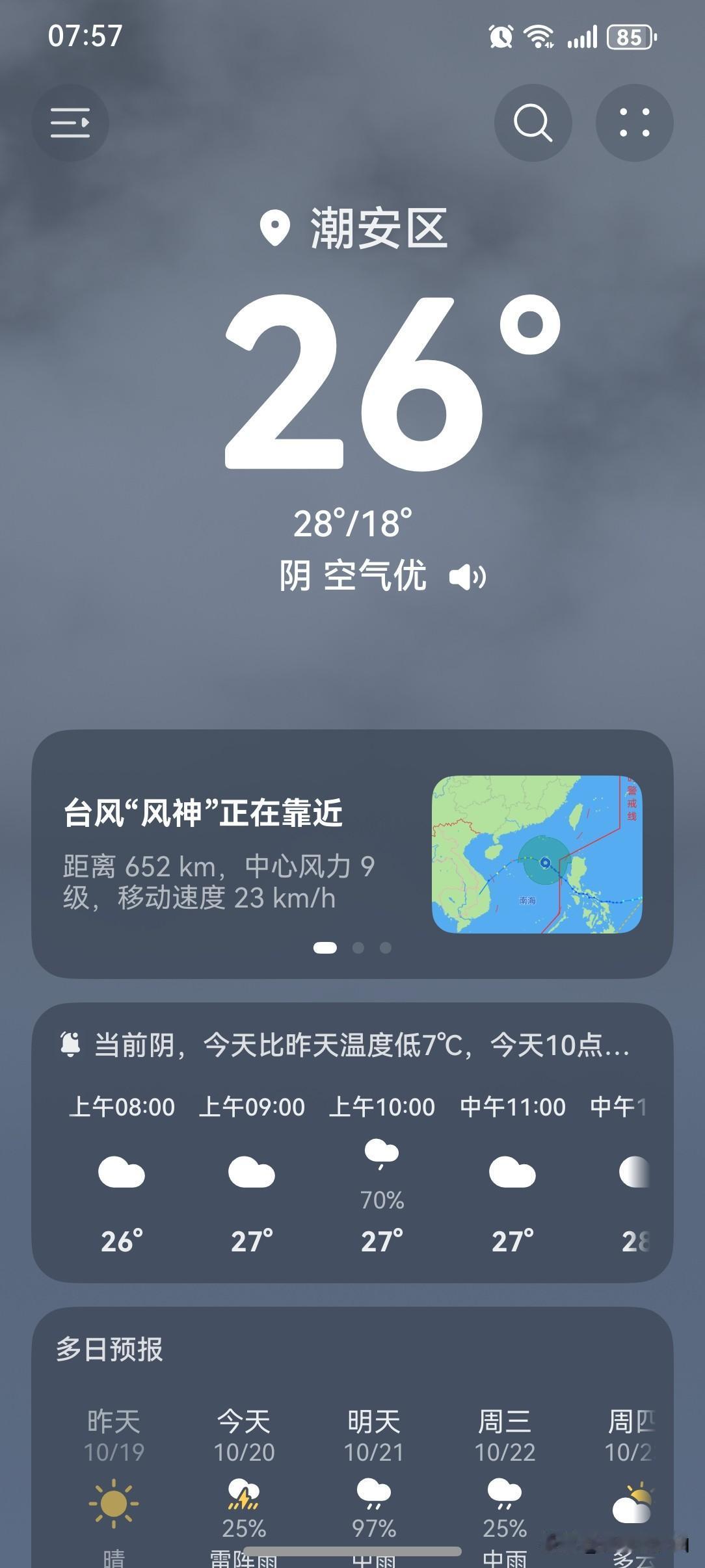 受冷空气影响, 南方降温模式开启, 北方大部将维持低温状态! 受"风神"和中等强度冷空气共同影响, 20~22日, 广东大部分市县气温自北向南逐渐下降, 过程降温幅度约6~10℃。 其中21~23日早晚体感清凉, 请注意及时增添衣物。 今天(20日), 潮州有雷阵雨, 气温18~28℃, 此刻气温26℃, 体感温度28℃。 看看今天的天空, 阴天云量增多,, 完全看不到太阳, 瞬间感觉凉爽了! 冷空气终于抵达我们这边, 气温也开始降下来了, 全天最高气温只有28℃, 非常凉爽舒适。 今天的天气, 必须五星好评! 如此天气! 元芳,你怎么看?
