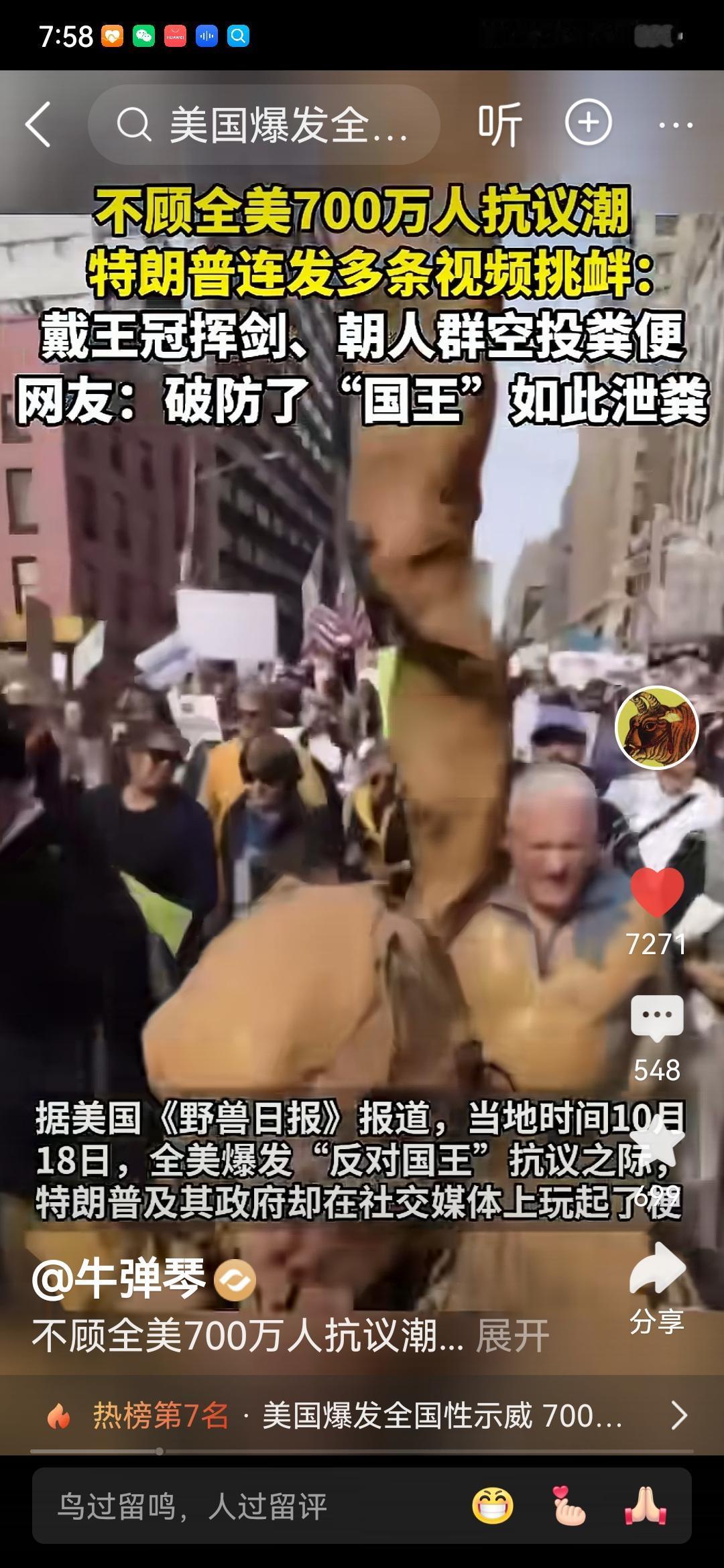 美国国内反特朗普的游行队伍已经700多万,但是这还不是最后的数据,最好够一半的美国人上街,特朗普才可能下台。 我们看到美国民众高举“我们不要国王”的标语,向特朗普政府表达他们的愤怒,表达他们的抗议。 我们不要生活在恐惧中,这是美国民众发自心底的担忧,因为基地组织发动的911事件给美国民众造成的伤害难以忘记。 美国不该是这样的,美国这样一意孤行,会让这个国家走向灭亡,这已经是几乎所有美国人的共识。 但是特朗普对这一次大规模的民众抗议却并不在意,他还干脆就戴上国王的帽子,挥动着利剑,发布向人群空投粪便的视频来回应。 我终于也看到了哈里斯的面孔,她声称要“将权力还给人民”。她在积极鼓励更多的民众上街游行。这就对了,她和她的团队不应该闲着,现在已经有2600多场的游行,但还远远不够,必须让更多的人参与,让美国人民觉醒,抗争,让特朗普这个玩意下台,走人。
