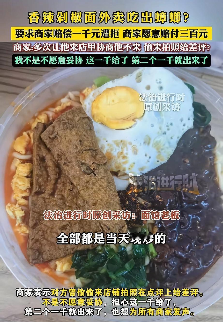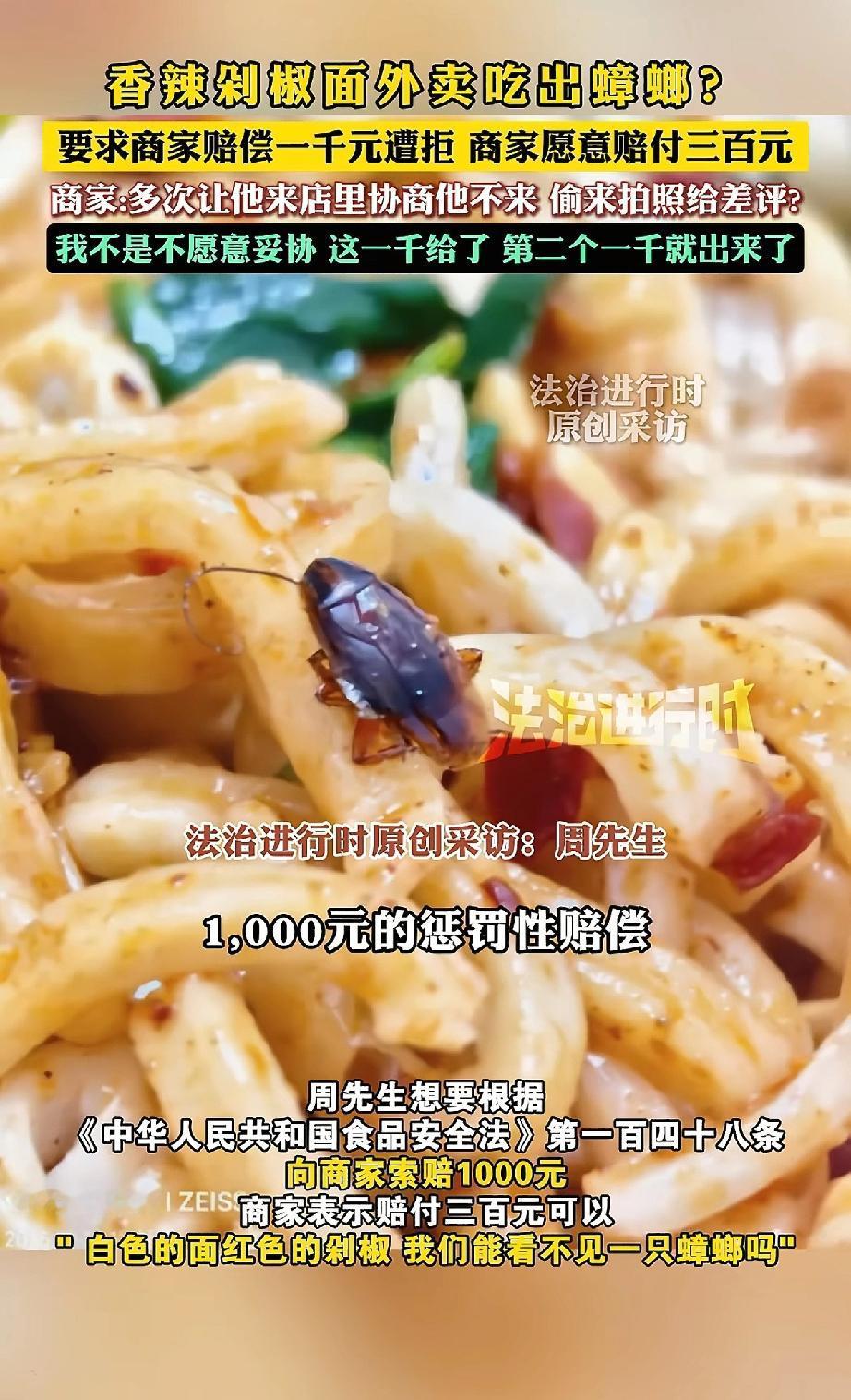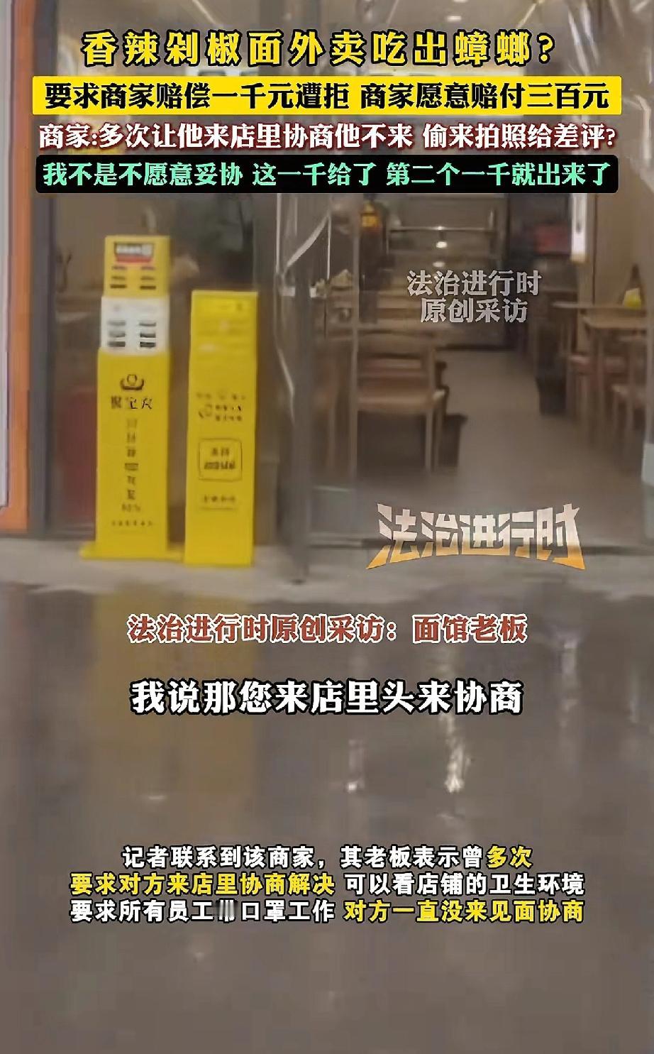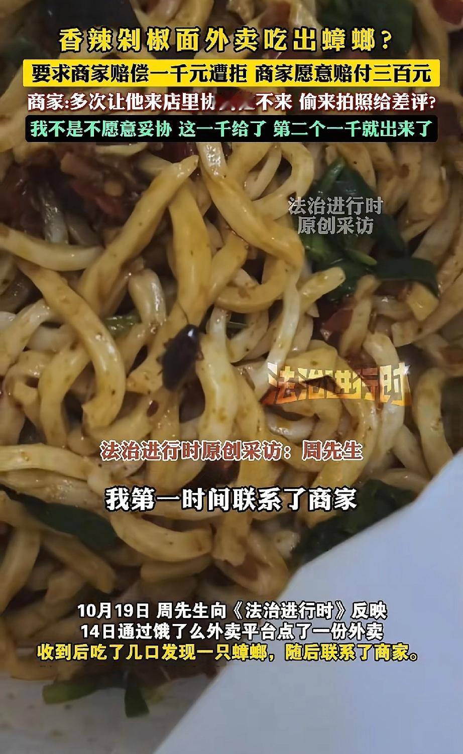 “万万没想到!”香辣剁椒面外卖吃出蟑螂?顾客要求商家赔偿一千元遭拒,商家愿意赔